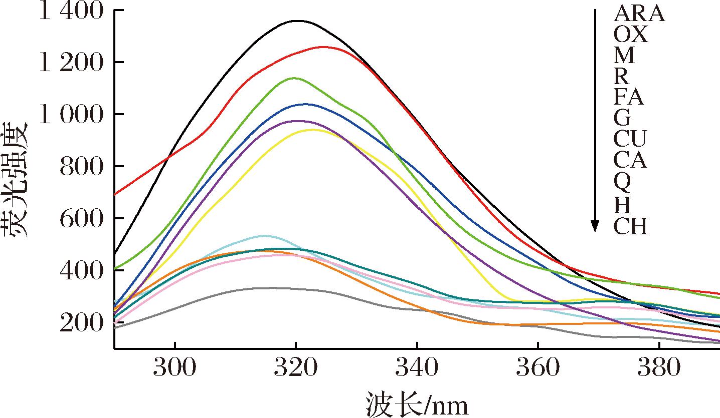 蛋白质在荧光光谱290 nm处强度可以一定程度上反映色氨酸残基的变化[21]。如图3所示,与ARA相比,OX的荧光强度降低且荧光峰位λmax显著红移,可能是花生球蛋白在LOX催化亚油酸氧化过程中,色氨酸残基逐渐暴露在外部环境中,被氧化为过氧自由基。经9种多酚干预后,相比OX荧光强度皆明显下降,其中CH的荧光强度最低,可能是多酚和花生球蛋白结合后,发生荧光猝灭所致[22]。多酚组的荧光峰位λmax皆显著蓝移,其中H和CH最为明显,可能是多酚的芳香环与花生球蛋白的色氨酸残基发生了共价交联和聚集[23]。荧光光谱的改变进一步证实了多酚的加入使花生球蛋白的结构发生变化。