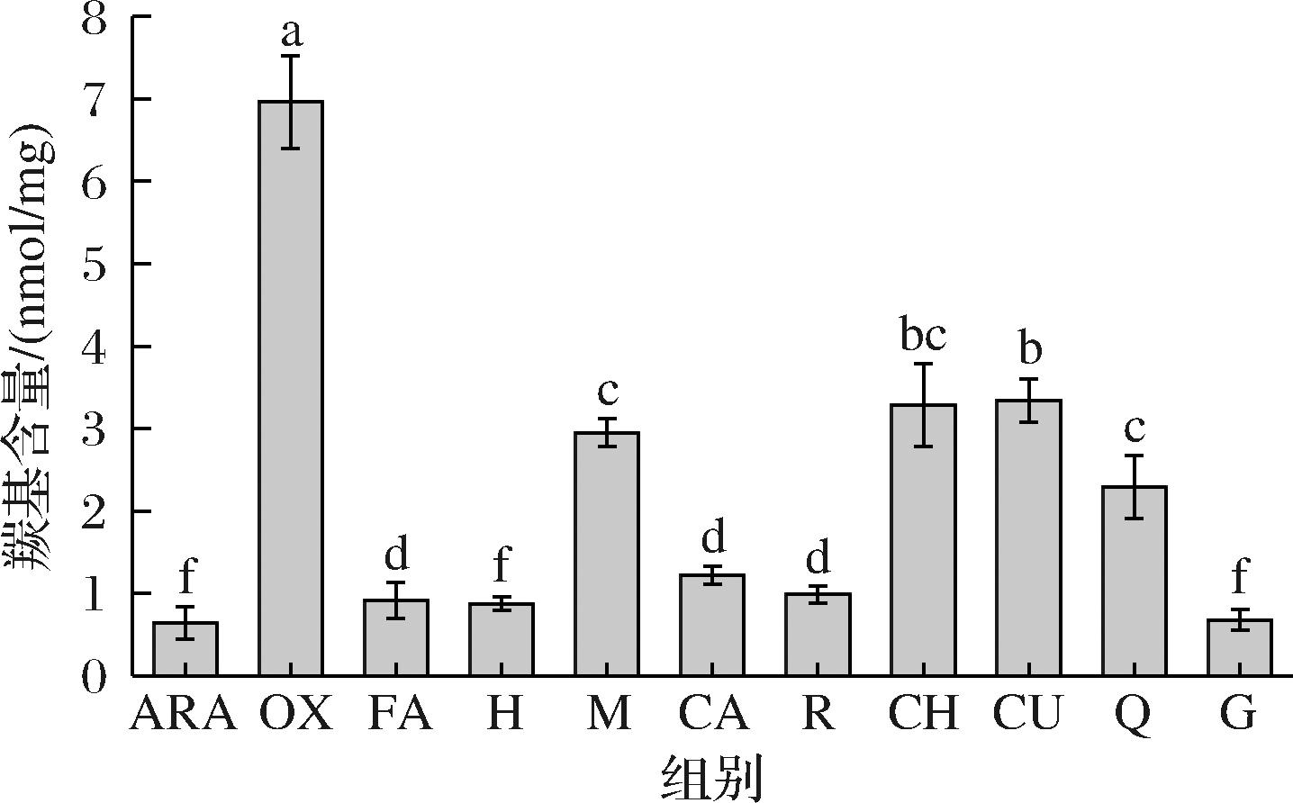 羰基是广泛用于评价蛋白质氧化程度的指标之一。蛋白质发生氧化反应时,侧链部分氨基酸易被转化成羰基基团,从而导致蛋白质羰基含量的增加。如图1所示,与ARA相比,OX的羰基含量显著上升(P<0.05),说明LOX催化亚油酸氧化生成氢过氧化物及次级产物,从而促进了花生球蛋白的氧化生成羰基,这与赵婕[16]对LOX诱导大豆蛋白氧化的研究结果一致。与OX相比,9种多酚的添加均可降低花生球蛋白的羰基含量,其中H、G两种多酚的抑制效果最为显著(P<0.05),分别使羰基含量下降87.4%、90.2%,接近于ARA。氧化体系经多酚干预后羰基含量之所以降低,可能是由于多酚和LOX通过氢键作用形成稳定的复合物,抑制其对亚油酸的催化氧化,从而减少氢过氧化物及次级产物的形成,使氧化体系中羰基含量下降[17]。