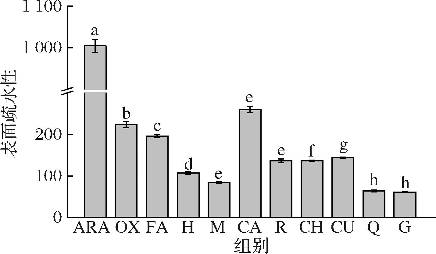 表面疏水性可反映暴露于蛋白质表面的疏水基团分布情况,并对蛋白质的性质有较大影响[24]。如图4所示,与ARA相比,OX的表面疏水性明显下降(P<0.05),可能是氧化使花生球蛋白的结构逐渐展开,并进一步在疏水作用和二硫键的作用下重新聚集,发生疏水坍塌[19],从而导致表面疏水性下降。经9种多酚干预后,花生球蛋白的表面疏水性有不同程度的上升或下降,其中CA使蛋白质表面疏水性有所上升,这可能是由于花生球蛋白的聚集体与多酚结合后解聚,内部疏水基团暴露,导致表面疏水性增加[25]。
