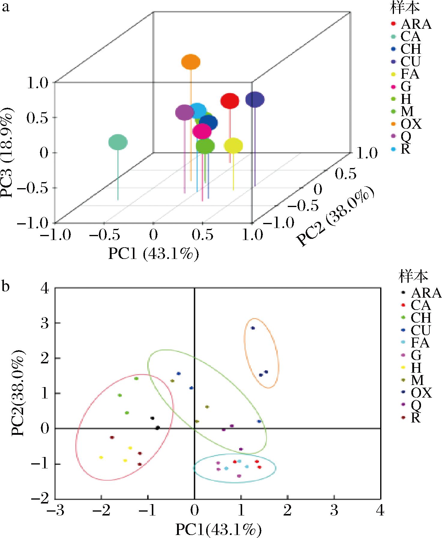 主成分分析常用于分析组间样本的整体分布趋势和不同组间样本的差异,样本在主成分分析图中与ARA越接近,则越相似。由图6-a可知,PC1的贡献率为43.1%,PC2的贡献率为38.0%,前2个主成分的累积贡献率达81.1%,表明前2个主成分能代表样本的变化。图6-b显示OX距ARA最远,说明花生球蛋白经LOX催化亚油酸氧化后结构和性质发生了明显变化,而经9种多酚干预后,各多酚组更靠近ARA,说明多酚干预可抑制花生球蛋白的氧化。这些多酚在主成分坐标图上可以分为3组,其中第1组(CH、H和R)与ARA最近,原因可能是CH、H、R结构中的特定官能团(如邻二酚羟基、酯键)使它们有效抑制LOX或清除自由基,因此蛋白氧化程度低,更接近ARA,说明这3种多酚的干预对花生球蛋白的氧化抑制效果最好。干预效果次之的是CA、G和FA组,与OX最近的是CU、M和Q组。CA、G和FA虽然羟基较多,但其部分羟基结构发生甲基化或糖基化,导致其活性降低。对于CU、M和Q,由于其结构中的共轭体系或羟基取代位置,虽然本身抗氧化能力强,但在反应体系中溶解度低,或不能有效接触LOX,导致其干预氧化的效果最差。综上,主成分分析图的分布反映了多酚结构对其抗氧化机制(如清除自由基、抑制LOX活性),以及与蛋白结合保护等的综合影响,进一步说明多酚干预可在一定程度上降低花生球蛋白的氧化进程[27]。