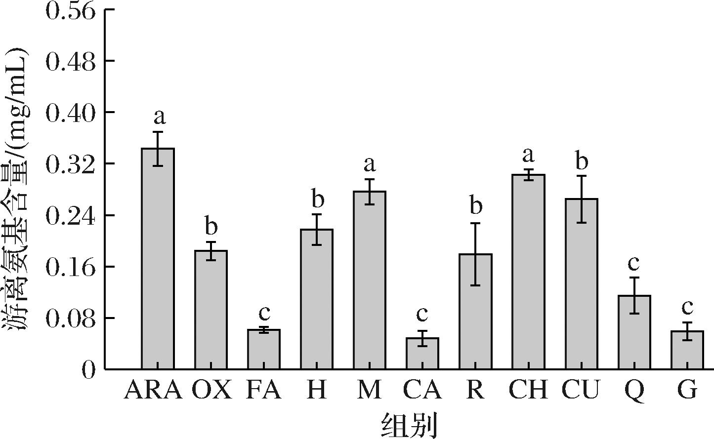 游离氨基的变化能一定程度上反映蛋白质结构的变化。如图2所示,相比ARA,OX的游离氨基含量显著下降,可能是因为花生球蛋白中含有—NH—或—NH2的氨基酸侧链参与了羰基的形成,这与羰基变化趋势相呼应(图1)。经9种多酚干预后,花生球蛋白的游离氨基呈不同程度的上升或下降趋势,其中M、CH上升最为明显,分别增大了0.092、0.119 nmol/mg[18]。而儿茶素使游离氨基下降最明显,可能是儿茶素在有氧条件下易氧化成醌,然后与花生球蛋白侧链发生共价作用形成C—S和C—N键[19]。不同种类的多酚对氧化体系中花生球蛋白的作用存在一定差异,从而影响其游离氨基的含量[20]。