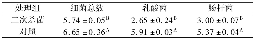 处理组细菌总数乳酸菌肠杆菌二次杀菌5.74±0.05B2.65±0.24B3.00±0.07B对照6.65±0.36A5.91±0.03A5.37±0.04A