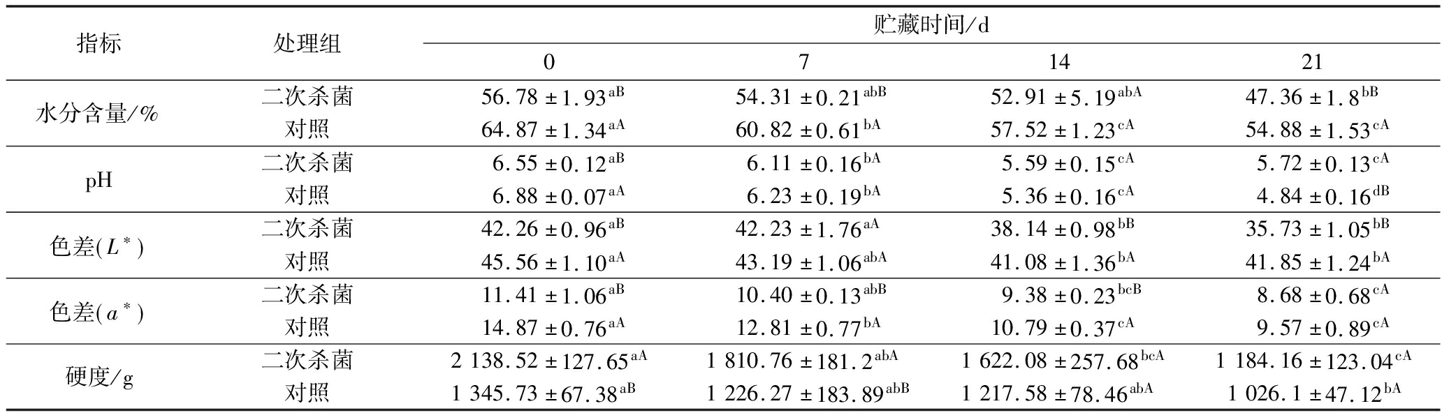 指标处理组贮藏时间/d071421水分含量/%二次杀菌56.78±1.93aB54.31±0.21abB52.91±5.19abA47.36±1.8bB对照64.87±1.34aA60.82±0.61bA57.52±1.23cA54.88±1.53cApH二次杀菌6.55±0.12aB6.11±0.16bA5.59±0.15cA5.72±0.13cA对照6.88±0.07aA6.23±0.19bA5.36±0.16cA4.84±0.16dB色差 L∗ 二次杀菌42.26±0.96aB42.23±1.76aA38.14±0.98bB35.73±1.05bB对照45.56±1.10aA43.19±1.06abA41.08±1.36bA41.85±1.24bA色差 a∗ 二次杀菌11.41±1.06aB10.40±0.13abB9.38±0.23bcB8.68±0.68cA对照14.87±0.76aA12.81±0.77bA10.79±0.37cA9.57±0.89cA硬度/g二次杀菌2138.52±127.65aA1810.76±181.2abA1622.08±257.68bcA1184.16±123.04cA对照1345.73±67.38aB1226.27±183.89abB1217.58±78.46abA1026.1±47.12bA