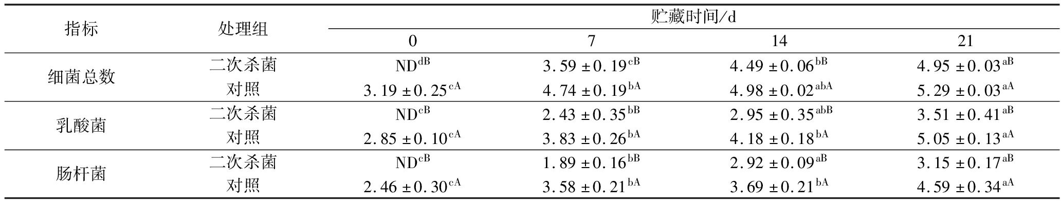 指标处理组贮藏时间/d071421细菌总数二次杀菌NDdB3.59±0.19cB4.49±0.06bB4.95±0.03aB对照3.19±0.25cA4.74±0.19bA4.98±0.02abA5.29±0.03aA乳酸菌二次杀菌NDcB2.43±0.35bB2.95±0.35abB3.51±0.41aB对照2.85±0.10cA3.83±0.26bA4.18±0.18bA5.05±0.13aA肠杆菌二次杀菌NDcB1.89±0.16bB2.92±0.09aB3.15±0.17aB对照2.46±0.30cA3.58±0.21bA3.69±0.21bA4.59±0.34aA