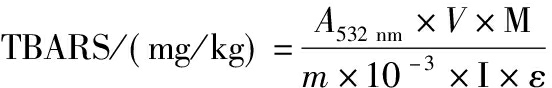 式中:V,样品体积,10 mL;M,TBARS的摩尔质量,144.15 g/mol;m,样品质量,g;ε,摩尔消光系数,152 000 L/(mol·cm);I,光程,1 cm。