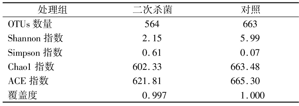 处理组二次杀菌对照OTUs数量564663Shannon指数2.155.99Simpson指数0.610.07Chao1指数602.33663.48ACE指数621.81665.30覆盖度0.9971.000