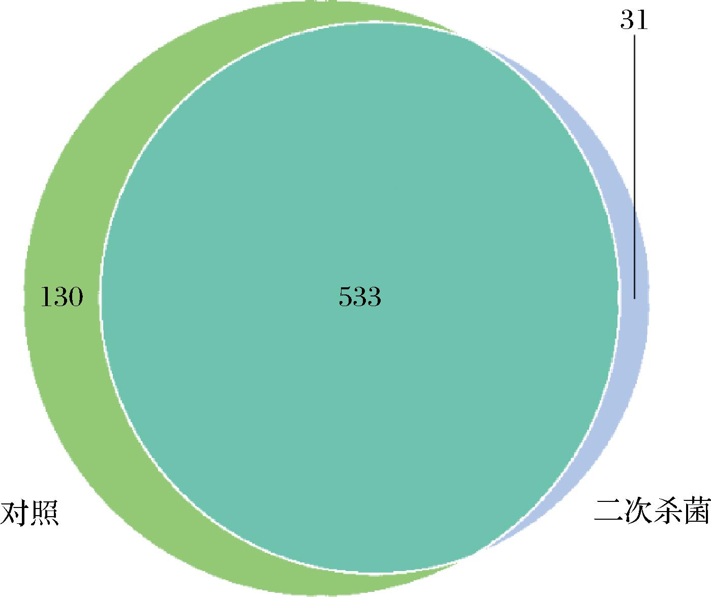 如表3所示,不同样品的覆盖度均达到99.7%以上,说明构建的文库可以真实有效地反应样品微生物数量的多样性。以97%的一致性将序列聚类成为OTUs,二次杀菌组OTUs为564,对照组为663。如图1所示,2个处理组共有OTUs数目为533,占总OTUs数目的76.80%,而对照组与二次杀菌组独有OTUs数目分别为130和31,说明2个处理组的菌群结构存在差异,且对照组物种丰度较大,二次杀菌处理降低了烤鹅中的微生物种类。Shannon和Simpson指数可以评价样品群落的多样性,Shannon指数越高、Simpson指数越低则群落物种多样性程度越高。Chao1和ACE指数常用于评价样品群落物种的丰富度,数值越大群落物种的丰富度越高。对照组的Shannon指数高于二次杀菌组,Simpson指数则低于二次杀菌组,证明对照组细菌菌群多样性高于二次杀菌组。且对照组的Chao1和ACE指数均高于二次杀菌组,对照组烤鹅中的细菌菌群丰富度高于二次杀菌组,说明二次杀菌处理对于胀袋真空包装烤鹅的菌群结构影响显著。