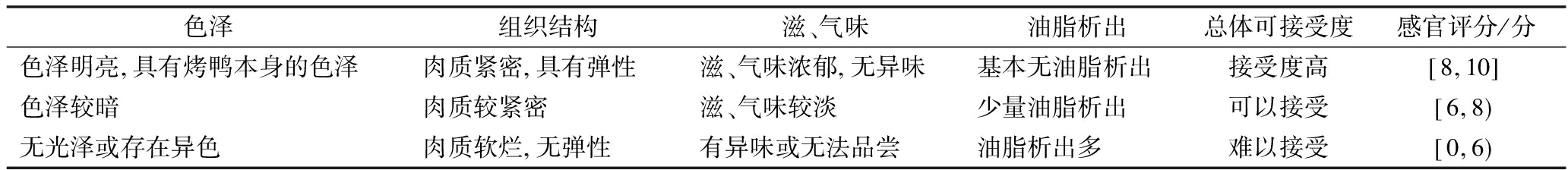 色泽组织结构滋、气味油脂析出总体可接受度感官评分/分色泽明亮 具有烤鸭本身的色泽肉质紧密 具有弹性滋、气味浓郁 无异味基本无油脂析出接受度高 8 10 色泽较暗肉质较紧密滋、气味较淡少量油脂析出可以接受 6 8 无光泽或存在异色肉质软烂 无弹性有异味或无法品尝油脂析出多难以接受 0 6