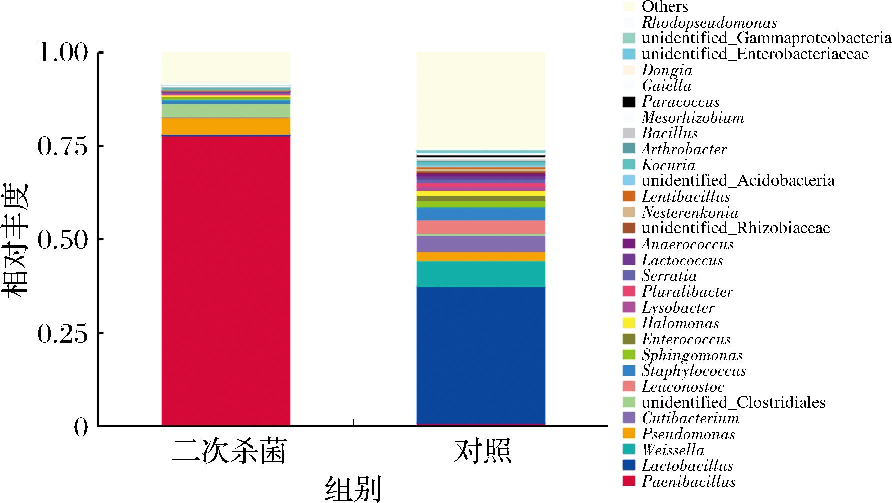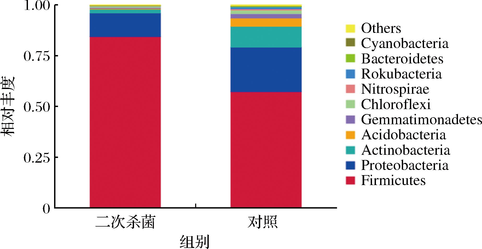 2个处理组样品共检测到1 227 OTUs,全部属于细菌域。图2所示为相对丰度占比前10的门,其中二次杀菌组在门水平细菌组成较为简单,主要为84.51%的厚壁菌门(Firmicutes)、11.30%的变形菌门(Proteobacteria)和1.96%的放线菌门(Actinobacteria),其余门水平细菌相对丰度均小于1%。对照组在门水平相对丰度超1%的包括厚壁菌门57.22%、变形菌门21.94%、放线菌门10.47%、酸杆菌门(Acidobacteria)3.9%、芽单胞菌门(Gemmatimonadetes)2.03%和绿弯菌门(Chloroflexi)1.8%。说明导致真空包装烤鹅胀袋腐败的细菌可能主要是厚壁菌门,在2个处理组中相对丰度均超过50%,但二次杀菌处理使细菌组成在门水平变得较为简单,相对丰度超过1%的细菌减少。有研究表明厚壁菌门和变形菌门是具有致腐能力的常见菌门[8]。杨鸿博等[9]在研究牛排贮藏过程中也发现厚壁菌门是气调包装和真空包装牛排贮藏末期的优势菌群,与本研究结果一致。