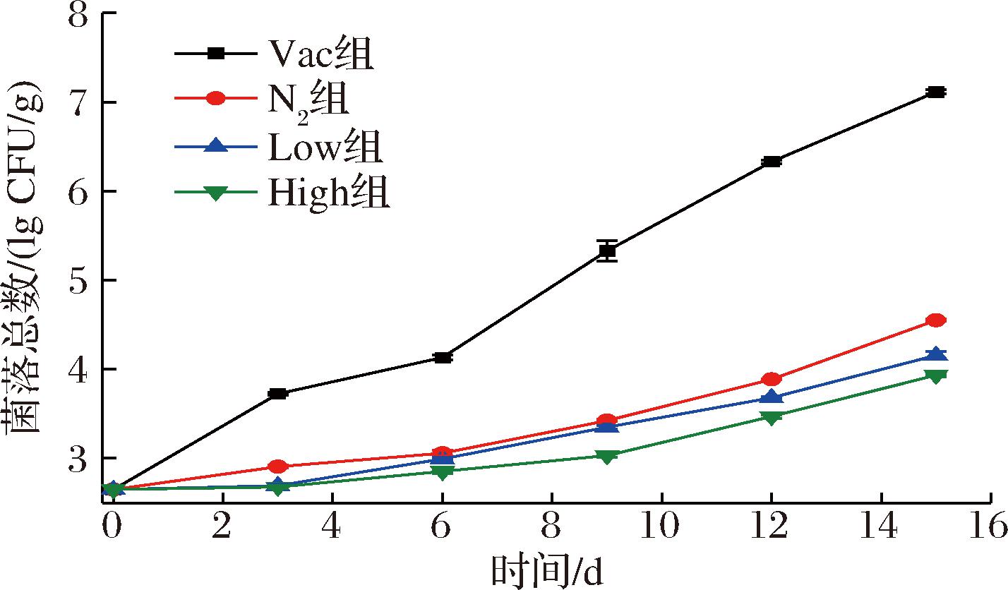 如图3所示,Vac组的菌落总数整体较高。在贮藏第6天,Vac和N2组的菌落总数分别是4.13、3.06 lg CFU/g,Low CO组和High CO组的分别是2.99、2.85 lg CFU/g,其中Vac组已超过新鲜肉的菌落标准(4 lg CFU/g),其余3组均符合新鲜肉的菌落标准。第12天,Vac组、N2组、Low CO组、High CO组的菌落总数分别为6.33、3.89、3.68、3.47 lg CFU/g,Vac组达到了次鲜肉的菌群指标(4~6 lg CFU/g),而另外3个组依然符合新鲜肉的菌落标准。第15天,Vac组、N2组、Low CO组、High CO组的菌落总数分别为7.11、4.55、4.16、3.93 lg CFU/g。Vac组菌群的生长速率最高,已经属于变质肉(>6 lg CFU/g),N2组和CO组对微生物的增殖具有抑制作用,在贮藏第15天后菌落总数明显低于Vac组,符合次鲜肉的菌落标准(4~6 lg CFU/g),而High CO组仍符合新鲜肉标准(<4 lg CFU/g)。由此可以看出,气调包装对抑制肉品中的微生物滋生有较好的效果,并且CO比N2具有更好的抑菌作用。