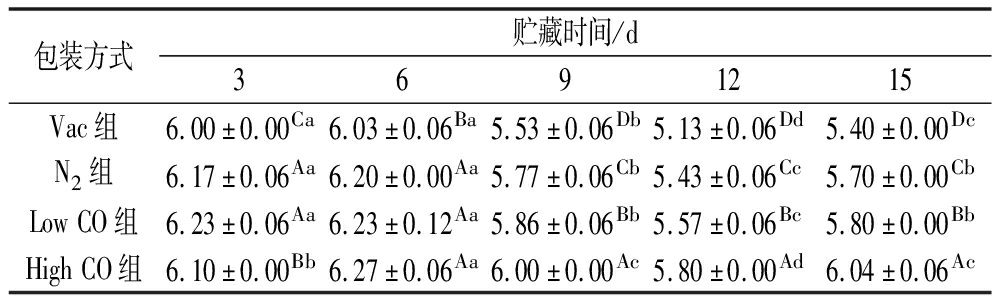 包装方式贮藏时间/d3691215Vac组6.00±0.00Ca6.03±0.06Ba5.53±0.06Db5.13±0.06Dd5.40±0.00DcN2组6.17±0.06Aa6.20±0.00Aa5.77±0.06Cb5.43±0.06Cc5.70±0.00CbLowCO组6.23±0.06Aa6.23±0.12Aa5.86±0.06Bb5.57±0.06Bc5.80±0.00BbHighCO组6.10±0.00Bb6.27±0.06Aa6.00±0.00Ac5.80±0.00Ad6.04±0.06Ac
