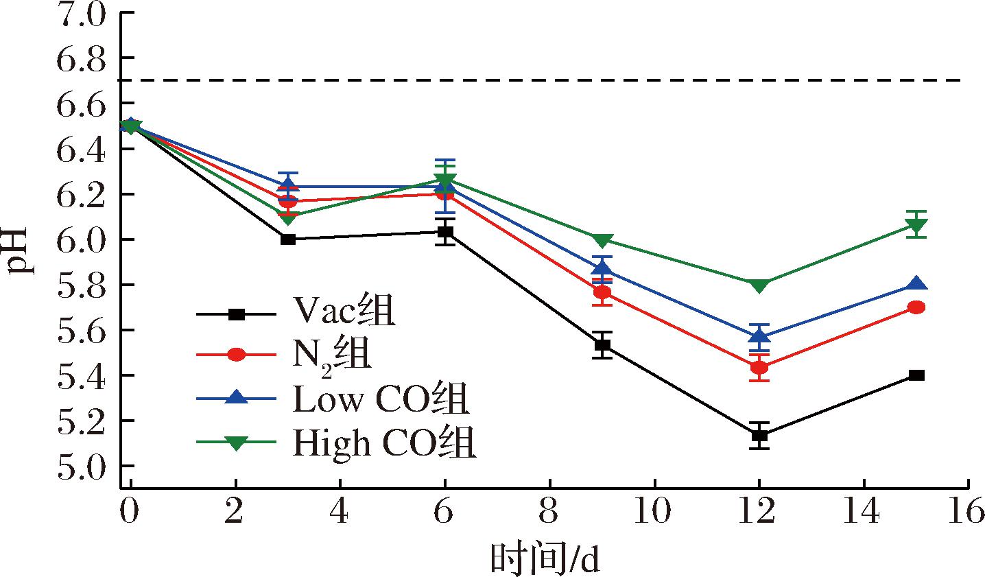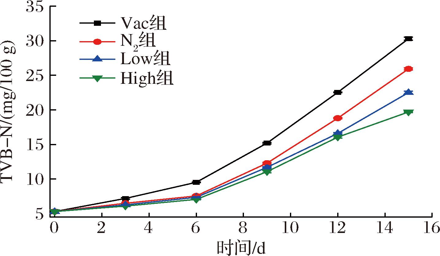 0~3 d,4组牛肉的pH下降;3~6 d,各实验组的pH基本保持稳定;6~12 d,pH继续下降,在第12天,pH值达到最低;12~15 d,4组牛肉的pH值均缓慢上升。总体来看,4组牛肉的pH值均呈先下降后升高的趋势(图2)。其中,High CO组的pH值最高,Low CO组和N2组次之,Vac组最低,但都低于腐败肉pH值的下限(pH=6.7,见图中虚线)。0~12 d,pH值下降可能是由于牛肉中含有大量的蛋白质,蛋白质会在微生物的作用下分解产生H2S等酸性气体,使牛肉的pH值下降;同时,4个实验组包装内均不含O2,由于肌肉糖原受到厌氧糖酵解酶的作用,产生大量的乳酸和丙酮酸也会造成体系pH降低,也引起了pH值降低。随着贮藏时间推移,12 d以后,4组牛肉的pH值有所提高,这可能与牛肉中蛋白质的分解形成碱性的胺类物质有一定的关系。在内部酶及其他微生物的共同参与下,牛肉中的蛋白质发生水解(蛋白质→多肽→氨基酸),氨基酸通过脱氨酶脱去氨基,生成游离氨(NH3)以及氮类碱性物质,从而使牛肉的酸碱度发生变化。在这个实验过程中,内源酶活性以及微生物活性可能与pH值的变化幅度相关。0~15 d,pH值变化幅度的顺序是:High CO组