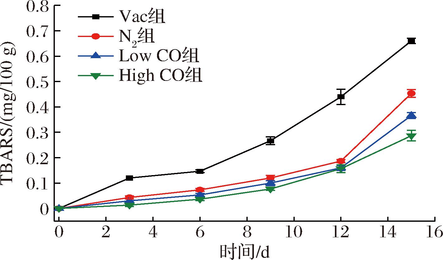 随着贮藏时间的延长,各组的TBARS均呈上升趋势(图5)。在贮藏前6 d,4组牛肉的脂肪氧化速度均较慢。从第9天开始各组脂肪氧化速率加快,Vac组、N2组、Low CO组、High CO组的TBARS值分别为0.27、0.12、0.10、0.08 mg/100 g,Vac组显著高于N2组、Low CO组和High CO组。至第9天,TBARS的上升速率显著提升,推测是实验持续进行中,细菌产生更多的脂肪酶,加速了肌肉内脂肪的分解,进而推动脂肪氧化的速率。而在整个贮藏过程中,不同气体对油脂氧化酶和相关微生物的生长都有一定的抑制作用,其中CO对这些物质的影响最为显著。这是由于脂肪氧合酶通常依赖铁离子(Fe2+/Fe3+),CO可与牛肉中这些金属离子结合,改变酶的空间构象,直接抑制其催化活性,从而减缓脂肪氧化反应。此外,CO可能通过清除自由基或与氧分子竞争结合位点,减少氧化链式反应的启动,进一步延缓脂质氧化。而对于N2来说,N2作为惰性气体,主要通过置换O2延缓氧化和好氧菌生长,但对厌氧菌无直接抑制作用,也无法干预酶活性。真空环境虽能抑制好氧菌,但可能导致厌氧菌(如乳酸菌、梭菌)增殖,且对内源性酶(如脂肪氧化酶)的活性无直接影响。因此,CO展现出更优异的保鲜功能,尤其在富含脂肪的食品(如牛肉)中效果显著[35]。