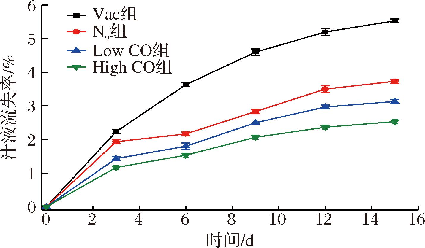 在整个实验时间内(0~15 d),4组牛肉的汁液损失率均逐渐增加(图1),[Vac组样品在不同气调包装下的汁液损失率变化幅度最大(5.5%)],这是因为在真空压力作用下,牛肉汁液更易流失。N2组、Low CO组、High CO组的汁液损失率分别为3.7%、3.1%、2.5%。其中,N2组的汁液损失率较CO组严重,这是由于CO可以形成稳定肌红蛋白结构,维持蛋白质的天然构象,保留更多水分[22]、也可以通过抑制氧化与微生物活动[23]、调节细胞代谢[24]等途径减少牛肉汁液损失。而在相同的贮藏时间条件下,N2则主要通过物理隔绝O2来发挥保鲜作用,无法直接参与抗氧化反应,且N2可以抑制需氧菌的生长,但对厌氧菌无明显抑制效果。此外,N2条件下牛肉中肌球蛋白容易出现不同程度的降解,从而导致其储存水分的网状结构减小,使其持水力降低,汁液损失增多[25-27]。N2缺乏对蛋白质结构和细胞代谢的主动调控能力。上述差异导致在CO条件下牛肉的保水性显著优于N2。