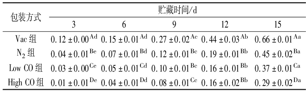 包装方式贮藏时间/d3691215Vac组0.12±0.00Ad0.15±0.01Ad0.27±0.02Ac0.44±0.03Ab0.66±0.01AaN2组0.04±0.01Be0.07±0.01Bd0.12±0.01Bc0.19±0.01Bb0.45±0.02BaLowCO组0.03±0.00Ce0.05±0.01Cd0.10±0.01Bc0.16±0.01Bb0.37±0.01CaHighCO组0.01±0.01De0.04±0.01Dd0.08±0.01Cc0.16±0.02Bb0.29±0.02Da