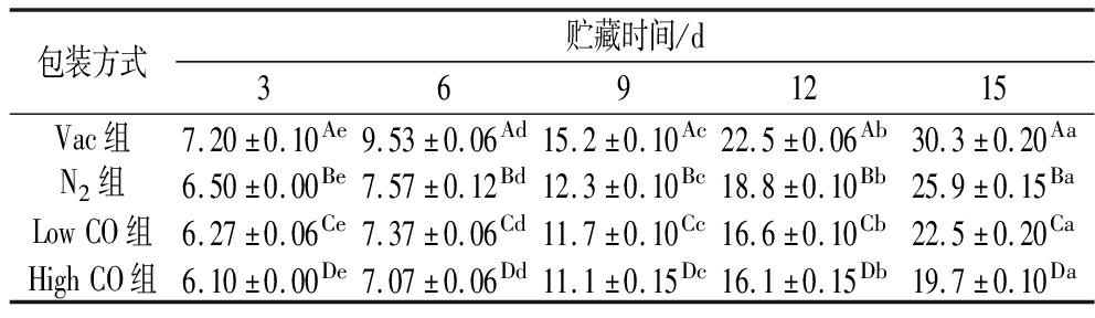 包装方式贮藏时间/d3691215Vac组7.20±0.10Ae9.53±0.06Ad15.2±0.10Ac22.5±0.06Ab30.3±0.20AaN2组6.50±0.00Be7.57±0.12Bd12.3±0.10Bc18.8±0.10Bb25.9±0.15BaLowCO组6.27±0.06Ce7.37±0.06Cd11.7±0.10Cc16.6±0.10Cb22.5±0.20CaHighCO组6.10±0.00De7.07±0.06Dd11.1±0.15Dc16.1±0.15Db19.7±0.10Da