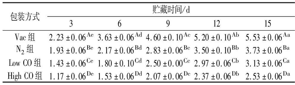 包装方式贮藏时间/d3691215Vac组2.23±0.06Ae3.63±0.06Ad4.60±0.10Ac5.20±0.10Ab5.53±0.06AaN2组1.93±0.06Be2.17±0.06Bd2.83±0.06Bc3.50±0.10Bb3.73±0.06BaLowCO组1.43±0.06Ce1.80±0.10Cd2.50±0.00Cc2.97±0.06Cb3.13±0.06CaHighCO组1.17±0.06De1.53±0.06Dd2.07±0.06Dc2.37±0.06Db2.53±0.06Da