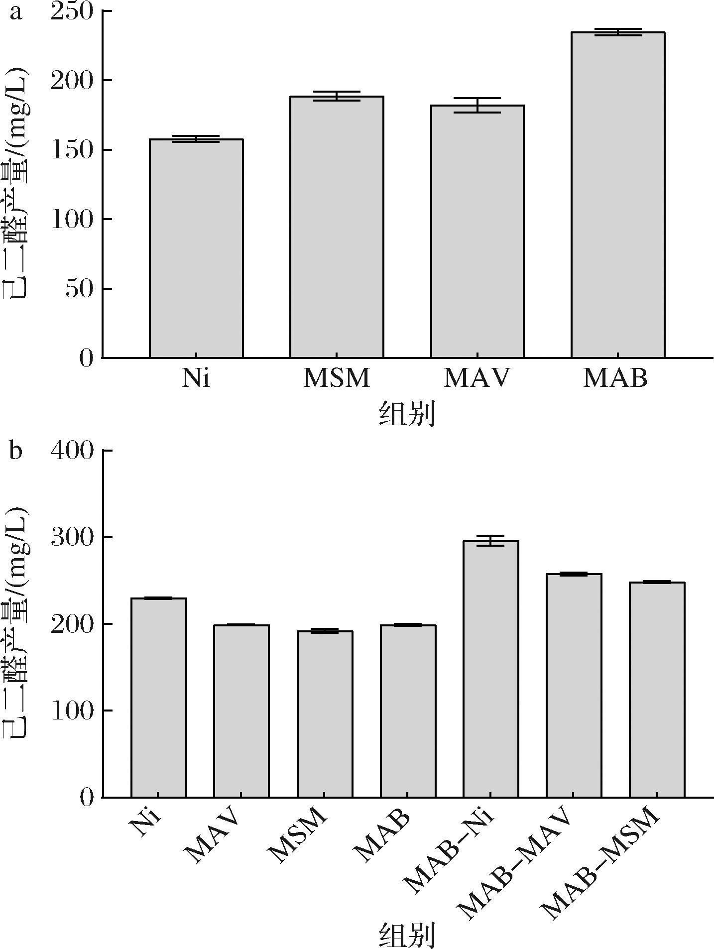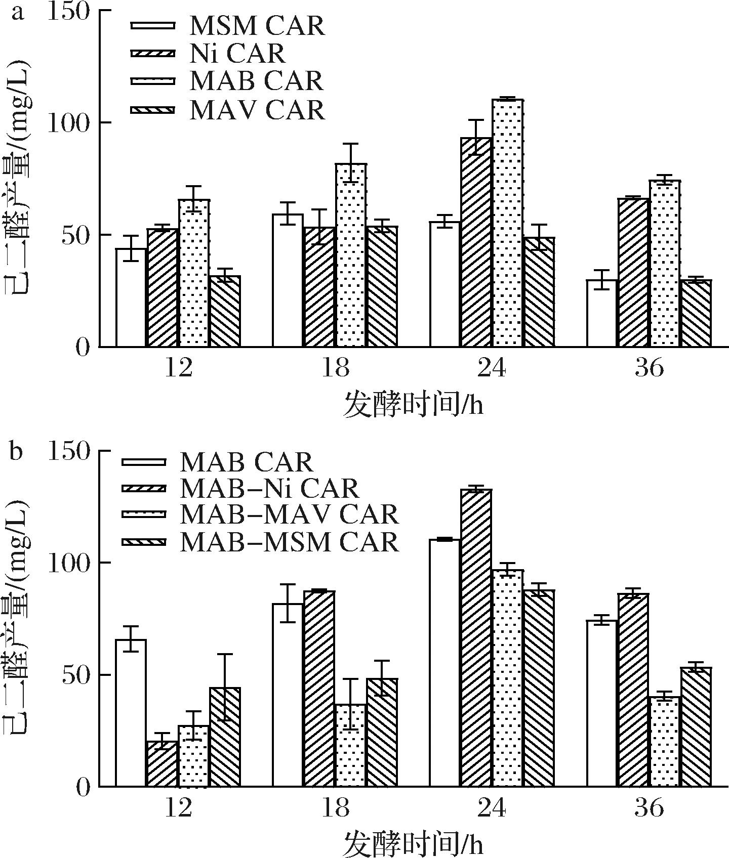 CAR具有十分广泛的底物谱[20],可接受多种脂肪酸作为底物,有研究报道来自海洋分歧杆菌的CAR可催化C4~C18脂肪酸形成相应的醛[21]。此外不同来源的CAR催化效果也大不相同,有研究表明来自Mycobacterium avium subsp.Paratuberculosis的MAV CAR(GenBank ID:WP_003872682)、来自Mycolicibacterium smegmatis MC2155的MSM CAR(GenBank ID:WP_011730755)、来自Mycobacteroides abscessus的MAB CAR(GenBank ID:WP_005082584)和来自Nocardia iowensis的Ni CAR(GenBank ID:OP604544)对己二酸皆具有较高的活性[22]。将上述MAV CAR、MSM CAR、MAB CAR、Ni CAR四种酶在E.coli BL21 △4中分别表达并进行摇瓶发酵(图5-a)。结果发现随着发酵时间的增加,己二醛产量先升高后降低,在24 h达到最高,且4种CAR中MAB CAR效果最好,在5 g/L的己二酸底物下己二醛产量达到110.5 mg/L,其次为Ni CAR,表明在4种CAR中MAB CAR对己二酸具有最好的催化活性。为了研究2种CAR的组合表达效果并与单酶的催化效果进行比较,进一步构建MAB-MSM CAR、MAB-Ni CAR、MAB-MAV CAR双酶表达系统,分别将4种质粒转化至E.coli BL21 △4并在相同的条件下进行摇瓶发酵(图5-b),结果发现双酶的催化效果随时间变化规律与单酶类似,其中最佳的双酶组合是MAB-Ni CAR,己二醛产量较单酶提高至133 mg/L,是原始菌株的14.9倍。