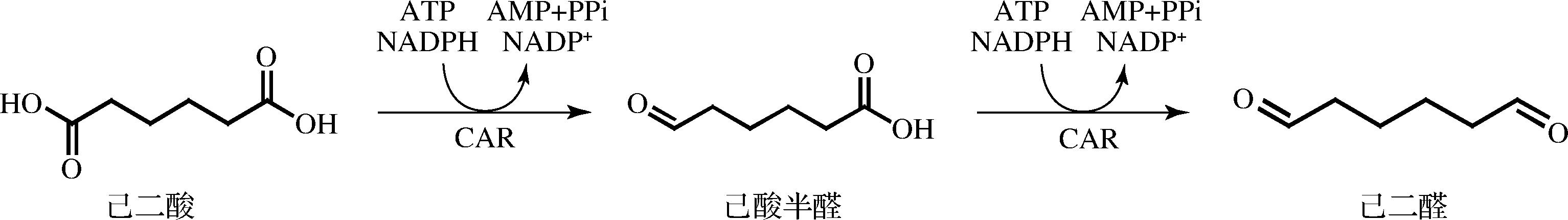 合成生物学和代谢工程可通过构建独特的代谢途径生产各种化学品[3],多种酶被报道可用于醛类物质的催化合成[4-5]。其中,羧酸还原酶(carboxylate reductase,CARs)(EC 1.2.1.30)借助ATP激活羧酸底物,并利用NADPH可将羧酸底物还原成相应的醛[6-7]。目前,已经鉴定出能够有效合成香草醛、肉桂醛、异丁醛和辛醛的多种CAR[3,8-10]。但是截至目前尚未有二元醛生物合成的系统研究,绝大多数报道都是围绕单醛合成展开,这可能是因为二醛的合成相较单醛更为复杂,猜测是因为经过氧化还原合成一个醛基生成半缩醛后底物结合位点化学能的改变使得第二个醛基的生成更为困难,因此研究生物合成己二醛具有重要意义,可以为脂肪族二醛的生物合成提供一定的借鉴。