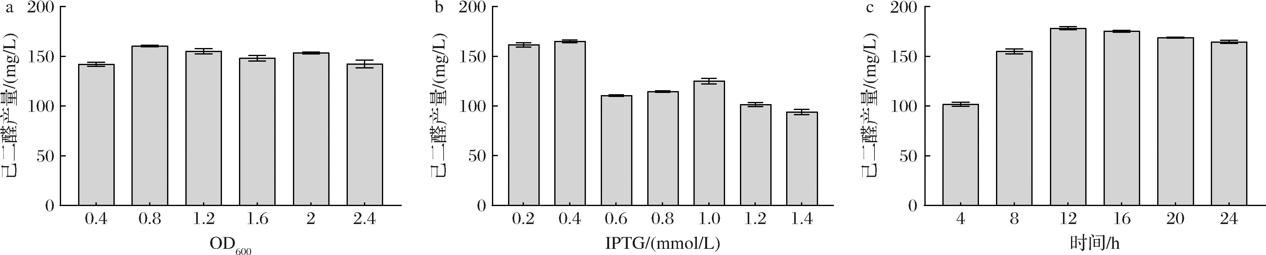 诱导OD600优化:为探究诱导OD600对己二醛产量的影响,分别在OD600为0.4、0.8、1.2、1.6、2、2.4时加入1 mmol/L IPTG,诱导后4 h加入1 g/L己二酸,并通过GC检测己二醛的最终产量。