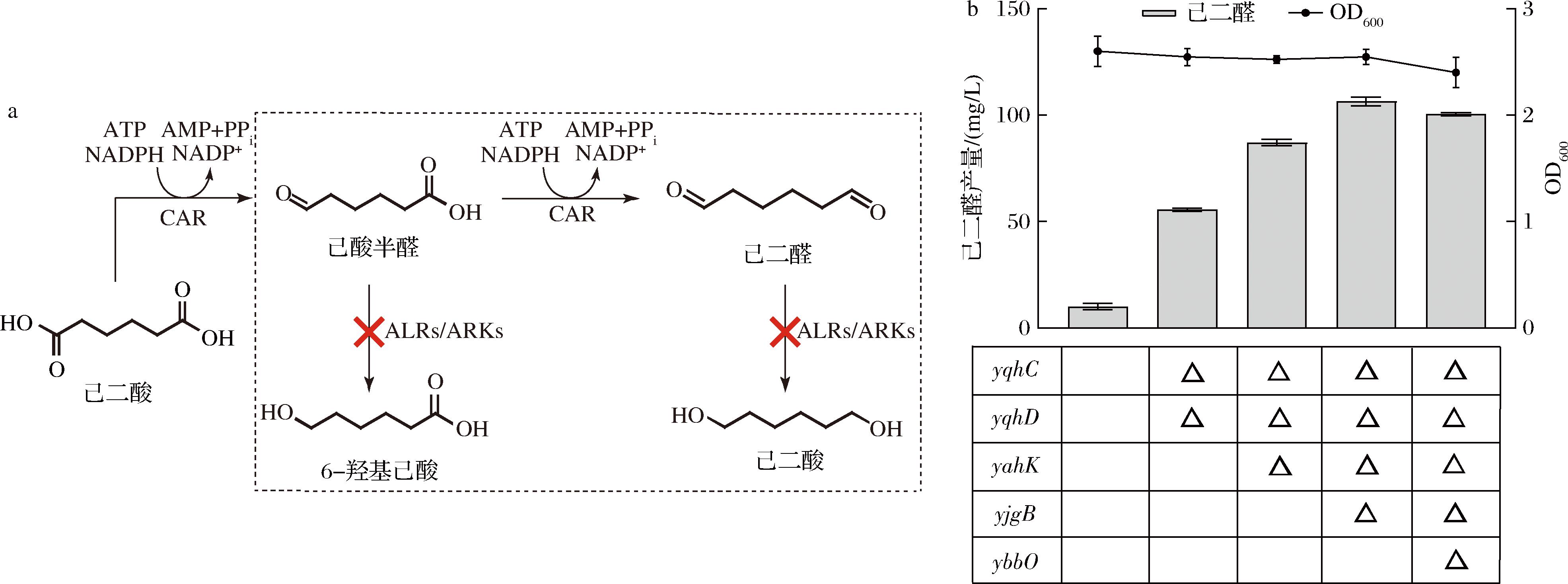 a-己二醛合成副产物;b-基因敲除对己二醛积累和细胞生长的影响