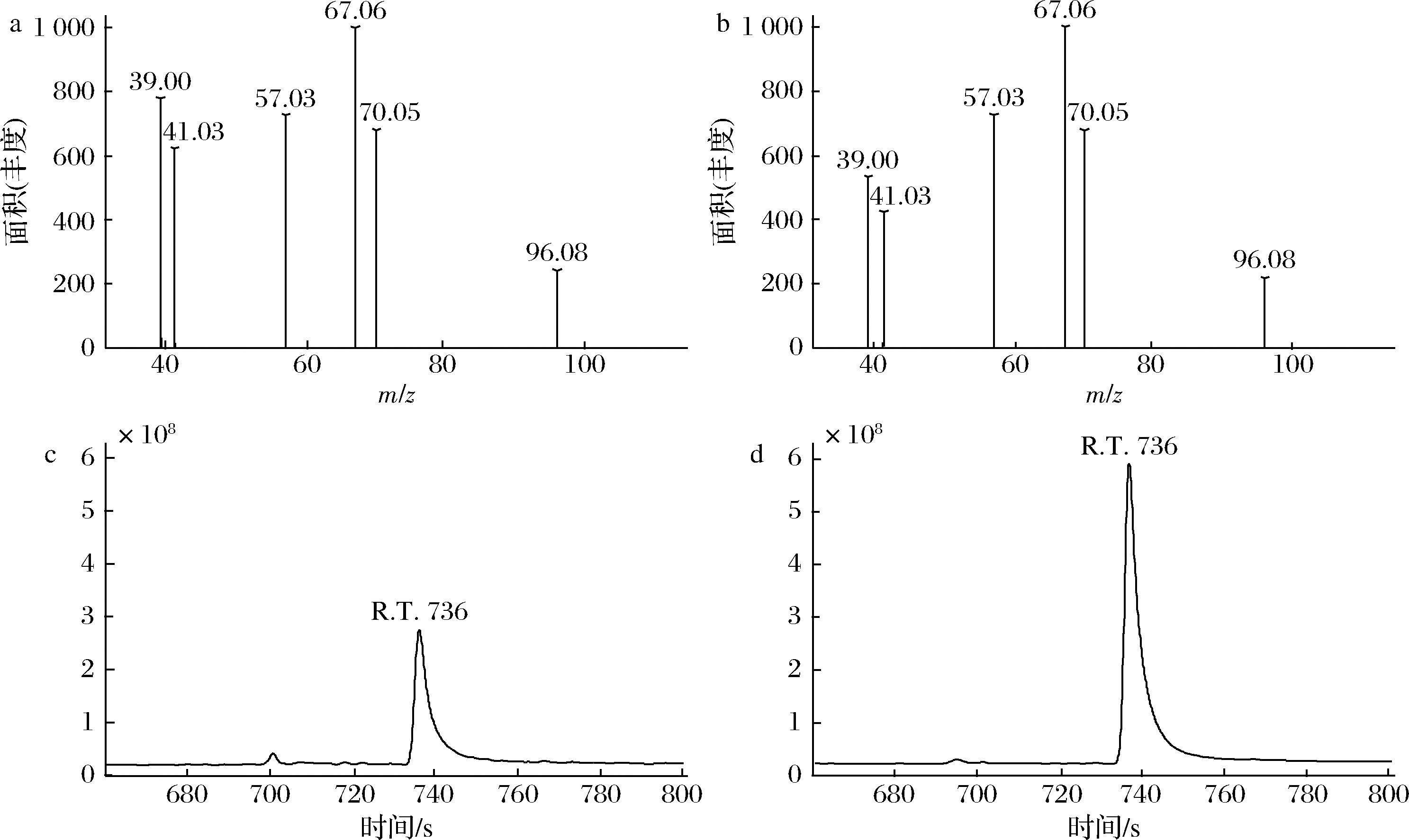 为了验证己二醛合成途径的成功构建,利用上述工程菌株进行己二酸催化研究,并进行气质联用分析(图3)。质谱分析(图3-a、图3-b)证实发酵样品与己二醛标准品碎片离子一致。此外,GC分析发现发酵样品和己二醛标准品具有相同的保留时间(图3-c、图3-d)。上述结果证实在大肠杆菌BL21(DE3)中己二醛的成功合成,其产量为8.9 mg/L,为进一步研究己二醛的生物法制备奠定了基础。