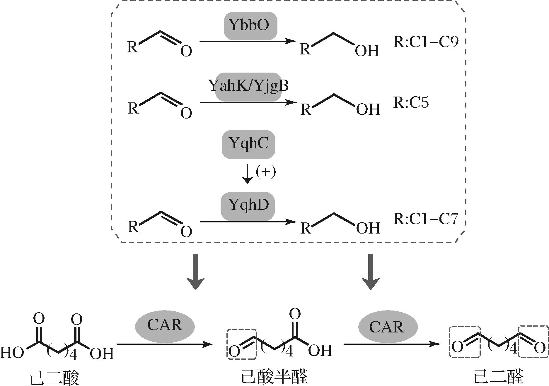 然而,大肠杆菌高活性内源醛还原酶(aldehyde reductase,ALR)/醛酮还原酶(aldo-keto reductase,AKR)会自动将醛转化为相应的醇[3],以防止醛基积累[11]。合理敲除大肠杆菌基因组中的ALRs/AKRs基因可减少竞争性醇的形成,RODRIGUEZ等[1]报道了一株能将C2~C12脂肪醛的还原通量显著降低的醛脱氢酶缺陷型大肠杆菌。ALR对己二醛生物合成的影响如图1所示,YahK和YjgB已被报道可以有效地催化己醛[1,8,12];而YbbO对C2-C10醛类底物均具有催化能力[1];同时,YqhD已被鉴定对包含己醛在内的多种碳链长度的醛类物质具有还原酶活性[13-14],而YqhC是YqhD的转录激活因子,且yqhC-yqhD基因簇是醛代谢调控的关键靶点[15],在大肠杆菌K-12 MG1655 RARE菌株中敲除yqhC、yqhD、yahK、yjgB基因可以削弱脂肪醛的过度还原[8]。