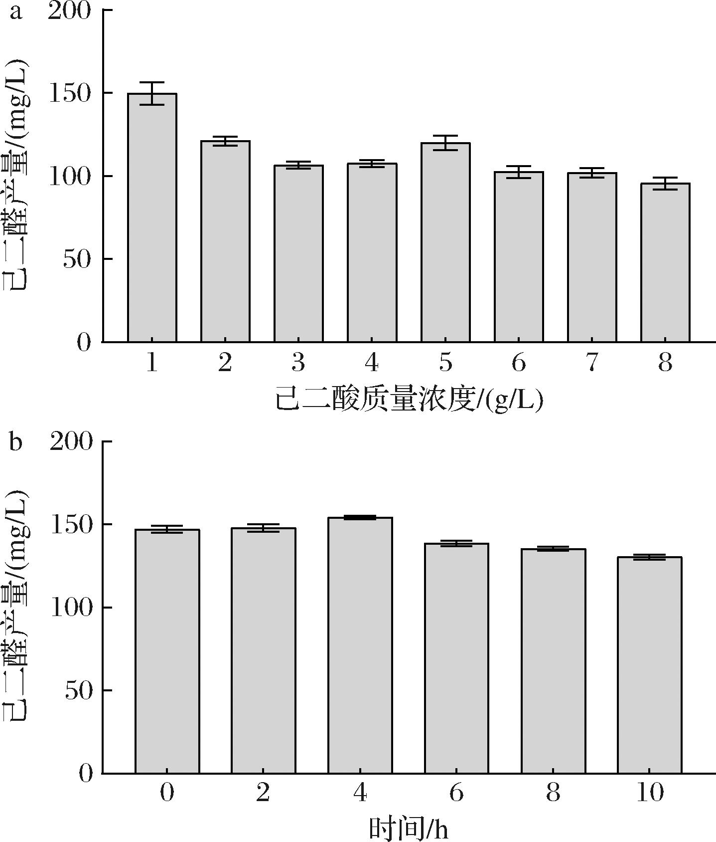 底物质量浓度是发酵过程中的一个重要影响参数[23]。本研究首先探究了不同的己二酸质量浓度下MAB-Ni CAR的催化效果(图6-a),结果显示较低的底物质量浓度更有利于己二醛的积累,其中1 g/L底物时己二醛产量最高,随着底物质量浓度增加己二醛积累量没有提升,可能是由于底盘细胞的自我保护机制,己二醛的毒性限制了其大量积累。此外,诱导后4 h是加入己二酸的最佳时机(图6-b),己二醛产量最高达到154.2 mg/L,是原始菌株的17.3倍。