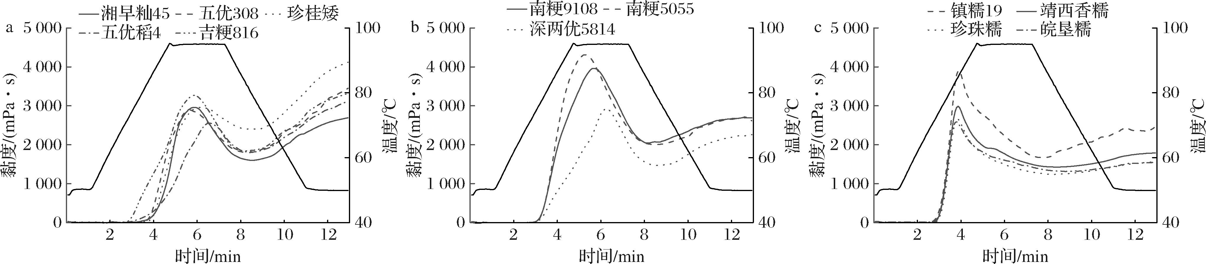如图3所示,参考吴殿星等[18]对大米淀粉 RVA糊化曲线图谱的分类方法,将本研究中的12种大米淀粉划分为中高AM型(>10%,湘早籼45、五优308、珍桂矮、五优稻4、吉粳816)、低AM型(5%~10%,深两优5814、南粳9108、南粳5055)和糯稻型(<5%,镇糯19、靖西香糯、皖垦糯、珍珠糯)。中高AM品种的糊化曲线表现为最终黏度高于峰值黏度、崩解值低且回复值高;低AM品种则呈现最终黏度低、回复值小的特征。糯稻品种的糊化曲线在起始至峰值阶段黏度迅速上升(曲线近乎垂直),而保温及冷却阶段曲线平缓且回复值低。因此,基于RVA糊化曲线的特征参数可筛选具有特定功能性质的大米品种用于不同加工场景。