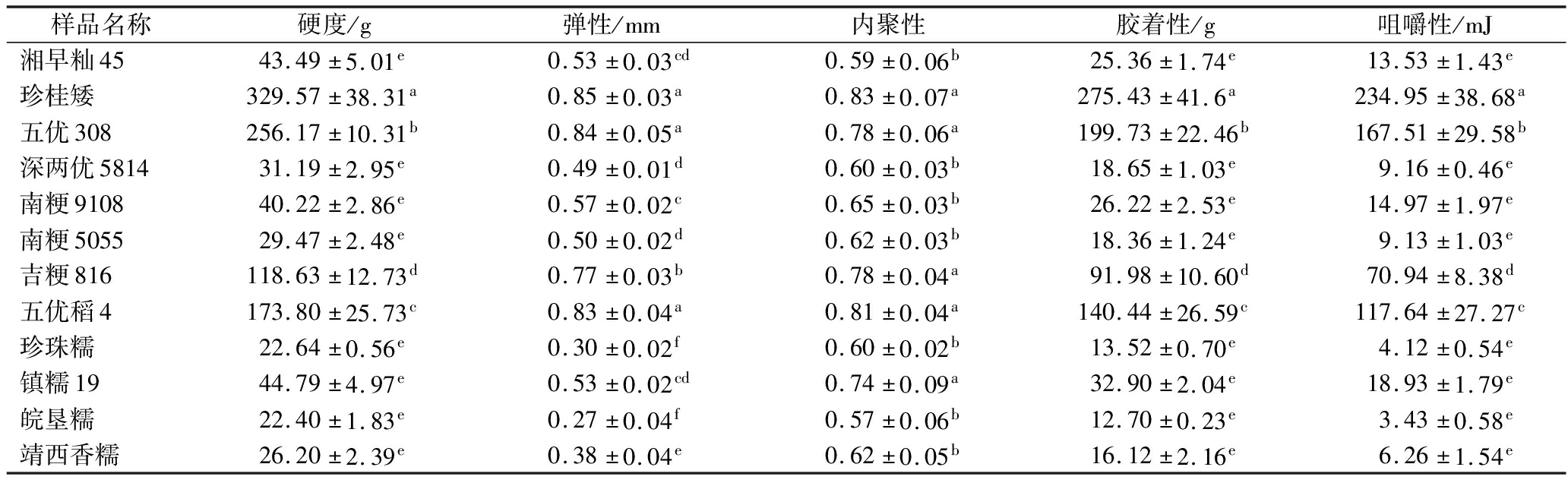 样品名称硬度/g弹性/mm内聚性胶着性/g咀嚼性/mJ湘早籼4543.49±5.01e0.53±0.03cd0.59±0.06b25.36±1.74e13.53±1.43e珍桂矮329.57±38.31a0.85±0.03a0.83±0.07a275.43±41.6a234.95±38.68a五优308256.17±10.31b0.84±0.05a0.78±0.06a199.73±22.46b167.51±29.58b深两优581431.19±2.95e0.49±0.01d0.60±0.03b18.65±1.03e9.16±0.46e南粳910840.22±2.86e0.57±0.02c0.65±0.03b26.22±2.53e14.97±1.97e南粳505529.47±2.48e0.50±0.02d0.62±0.03b18.36±1.24e9.13±1.03e吉粳816118.63±12.73d0.77±0.03b0.78±0.04a91.98±10.60d70.94±8.38d五优稻4173.80±25.73c0.83±0.04a0.81±0.04a140.44±26.59c117.64±27.27c珍珠糯22.64±0.56e0.30±0.02f0.60±0.02b13.52±0.70e4.12±0.54e镇糯1944.79±4.97e0.53±0.02cd0.74±0.09a32.90±2.04e18.93±1.79e皖垦糯22.40±1.83e0.27±0.04f0.57±0.06b12.70±0.23e3.43±0.58e靖西香糯26.20±2.39e0.38±0.04e0.62±0.05b16.12±2.16e6.26±1.54e