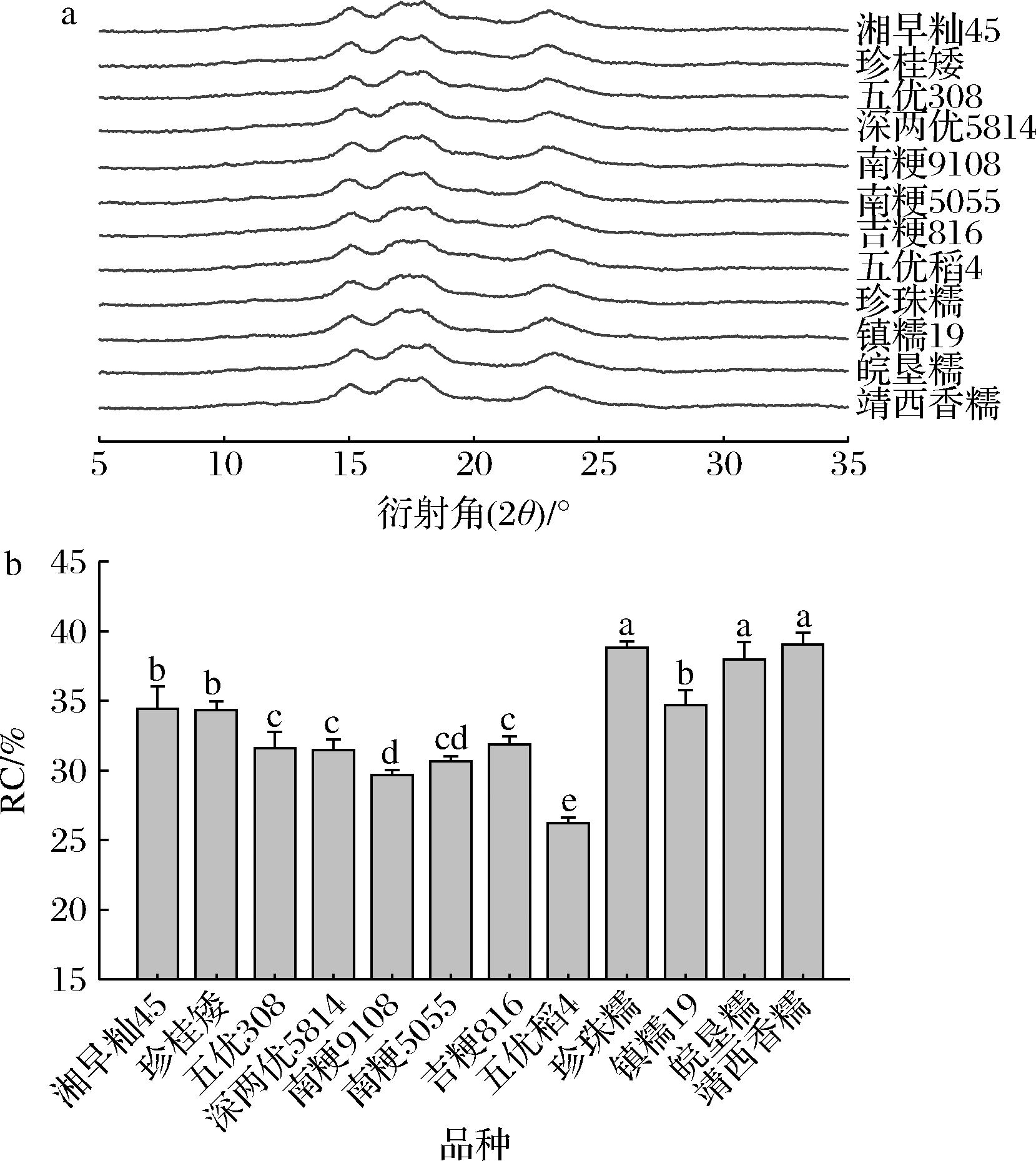 如图2-a所示,天然淀粉的晶体结构由结晶区和非结晶区交替组成,图谱中的尖峰衍射对应结晶区,而弥散衍射特征则反映非结晶区[12]。12种大米淀粉均呈现典型A型晶体结构,主要衍射峰位于2θ为15.1°、17.1°、18.1°和23.1°处,其中17.1°和18.1°处为相连的双峰,衍射强度最高,与文献报道一致[13]。尽管不同品种的大米淀粉衍射峰的位置相似,但其RC存在显著差异,范围在26.23%~39.07%(图2-b)。其中,靖西香糯的结晶度最高,而五优稻4最低。赵冰等[14]认为RC与AM含量呈现负相关关系,但在本研究中RC与AM含量呈现微弱负相关关系。微晶层基本单元是AP分子通过外链分支点聚集形成分子簇,并依靠羟基间氢键构建双螺旋结构;而AM分子通过与AP共结晶或相互缠绕,贡献或干扰结晶区比例[15],从而使RC与AM含量的负相关关系较弱。