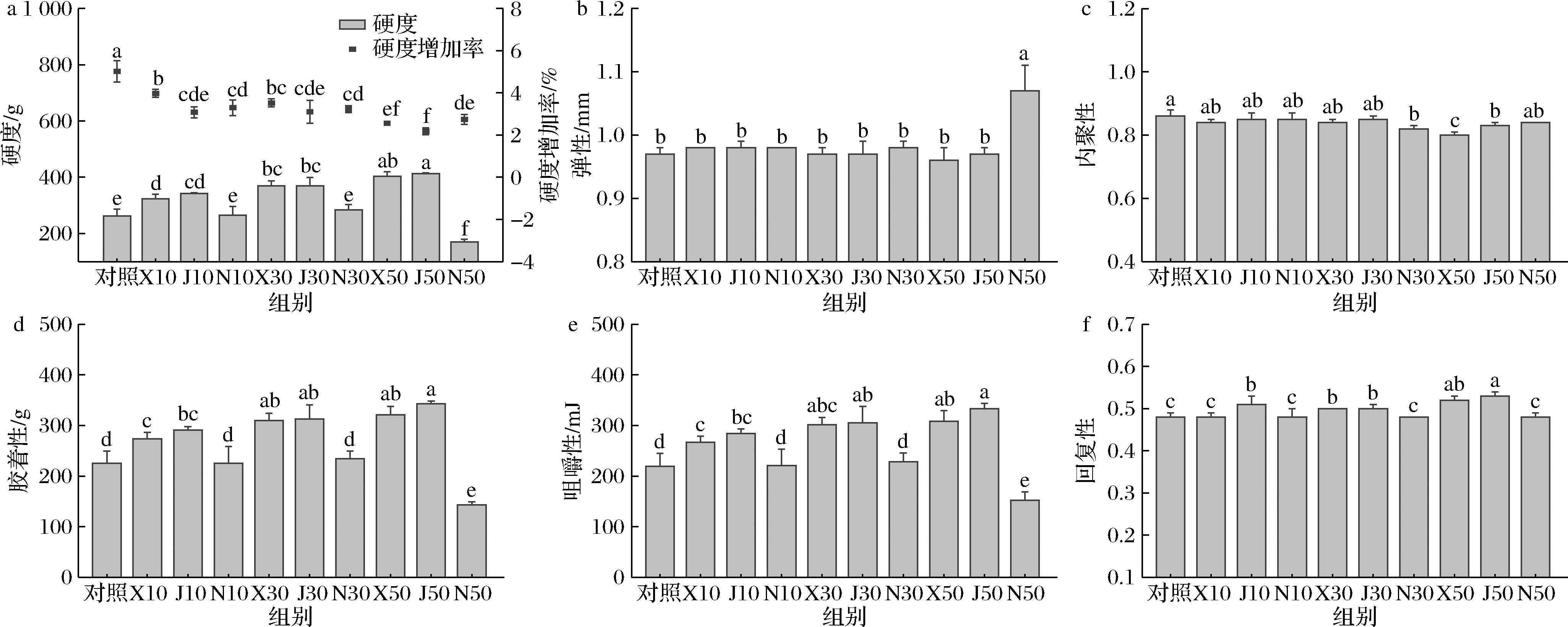 a-硬度及硬度增加率;b-弹性;c-内聚性;d-胶着性;e-咀嚼性;f-回复性