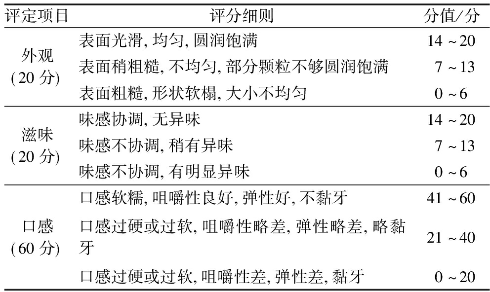 评定项目评分细则分值/分外观 20分 表面光滑 均匀 圆润饱满14~20表面稍粗糙 不均匀 部分颗粒不够圆润饱满7~13表面粗糙 形状软榻 大小不均匀0~6滋味 20分 味感协调 无异味14~20味感不协调 稍有异味7~13味感不协调 有明显异味0~6口感 60分 口感软糯 咀嚼性良好 弹性好 不黏牙41~60口感过硬或过软 咀嚼性略差 弹性略差 略黏牙21~40口感过硬或过软 咀嚼性差 弹性差 黏牙0~20