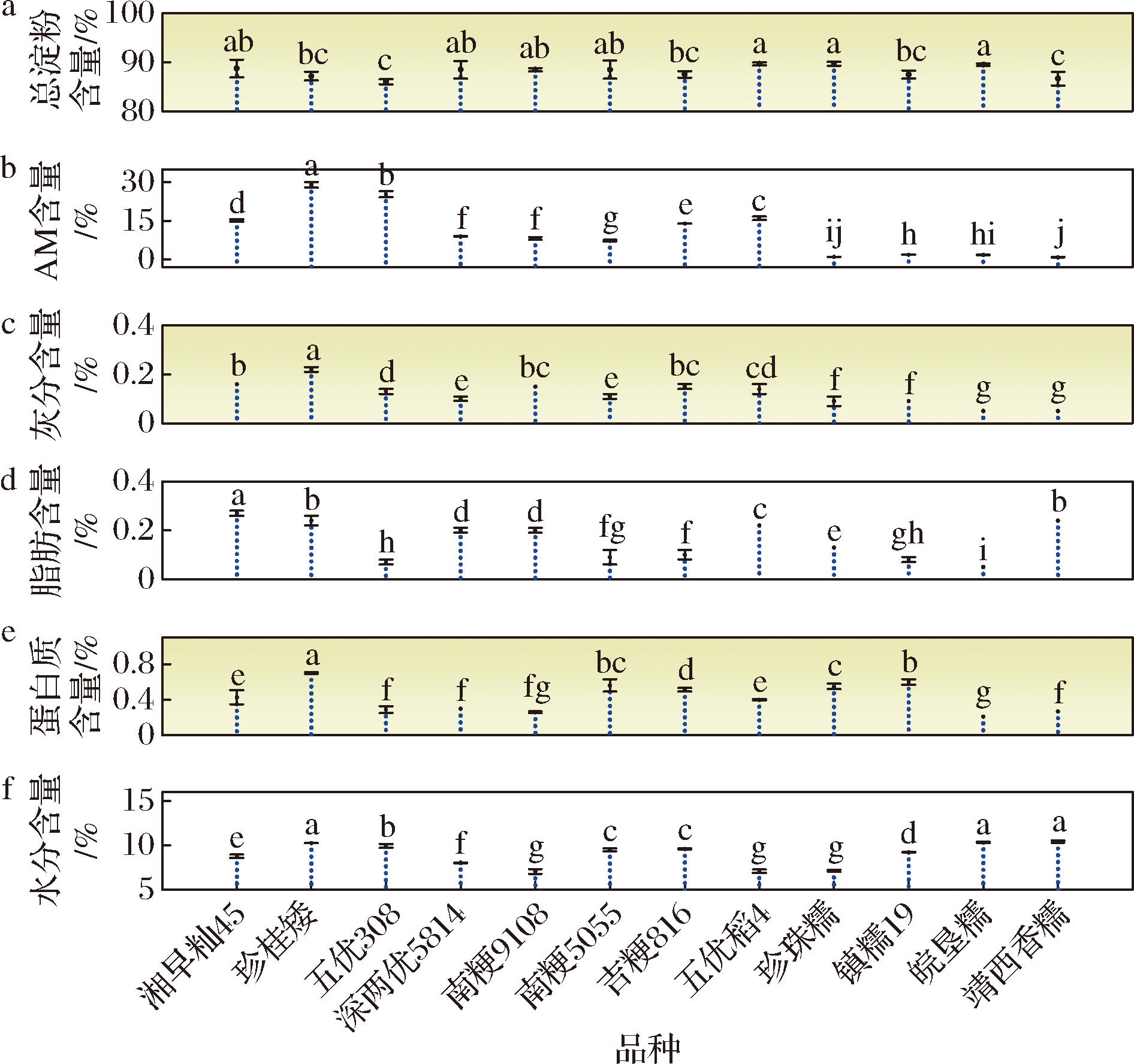a-总淀粉;b-AM;c-灰分;d-脂肪;e-蛋白质;f-水分
