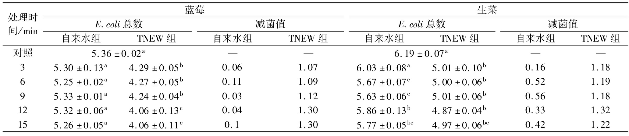 表3 TNEW处理对果蔬大肠杆菌总数的影响 单位:lg CFU/g