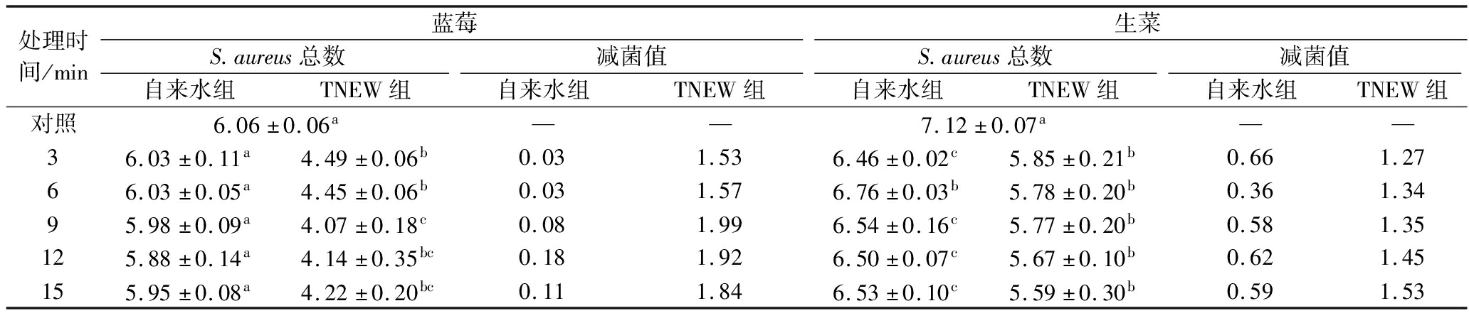 表4 TNEW处理对果蔬金黄色葡萄球菌总数的影响 单位:lg CFU/g