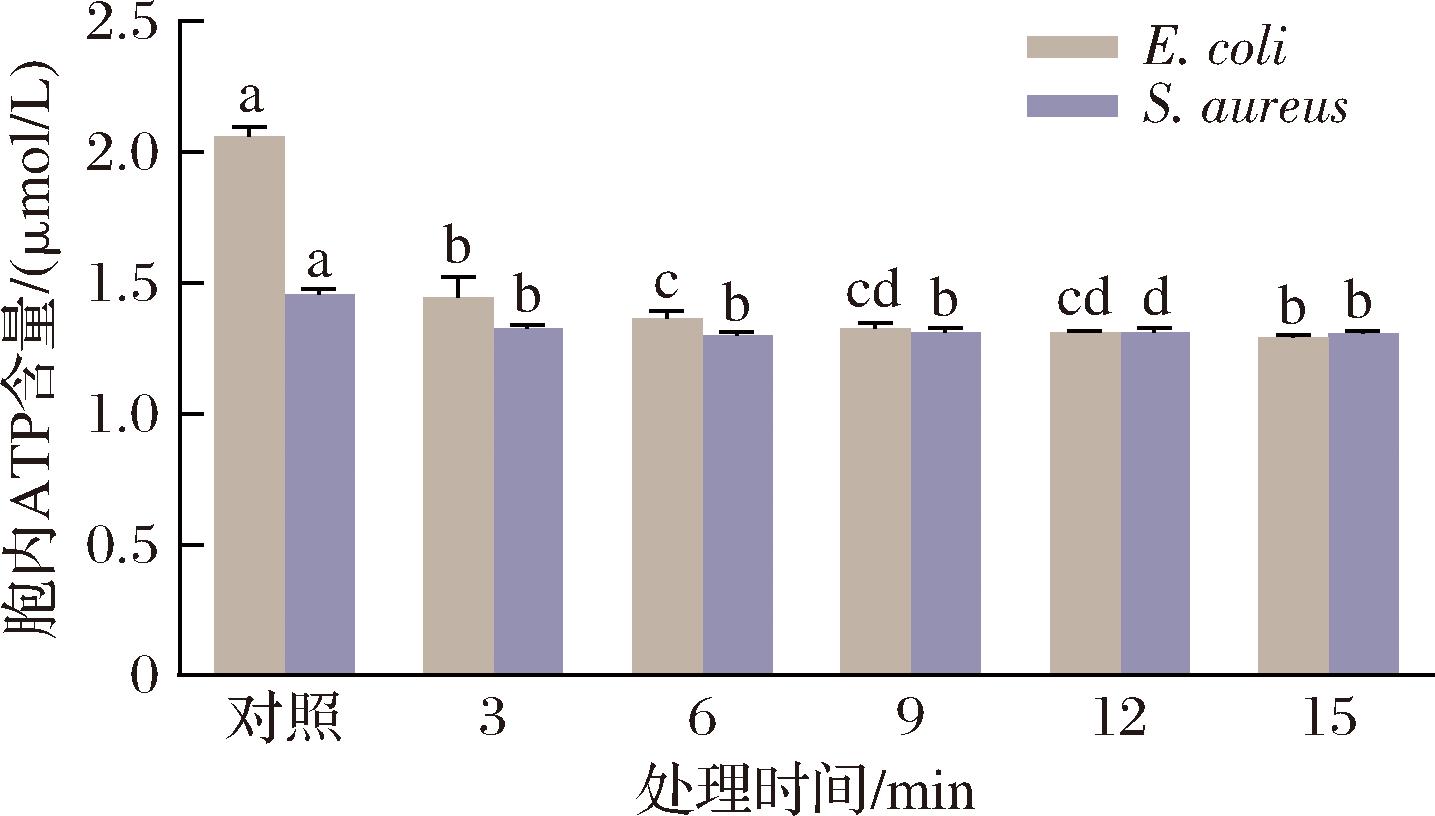 将处理后的菌液在4 ℃、10 000 r/min离心10 min,弃上清液,留细胞沉淀。按照检测试剂盒说明书测定胞内ATP含量。