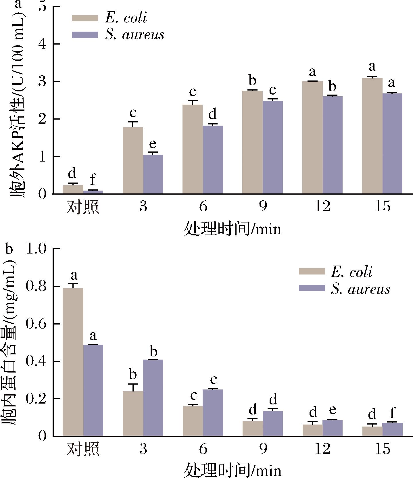 AKP作为定位于细菌细胞周质空间的标志性酶,其释放量与细胞壁结构完整性密切相关。当细胞壁受损时,AKP会从周质空间泄漏至胞外,导致胞外AKP活性升高,因此其胞外释放量可作为评估细胞壁完整性的有效生物标志物[15]。实验数据显示(图2-a),对照组中E.coli和S.aureus的细胞外AKP活性分别为0.24、0.09 U/100 mL,经TNEW处理3、6、9、12、15 min后,2种细菌的胞外AKP活性依次升至1.78、2.38、2.75、3.00、3.08 U/100 mL和1.05、1.82、2.48、2.60、2.69 U/100 mL。这种时间依赖性损伤表明,TNEW处理对细胞壁完整性的破坏随处理时间的延长而持续增强(P<0.05)。上述结果与张晓丽[16]的电化学消毒实验结果一致。TNEW产生的·OH可能优先攻击细胞壁肽聚糖的关键化学键(β-1,4糖苷键),导致细胞壁网状结构解体[17];同时,活性氯凭借其高渗透特性,可穿透细胞壁屏障,通过修饰细胞壁特异性酶(青霉素结合蛋白)的活性位点,抑制肽聚糖交联修复过程[18]。这种双途径协同作用导致细胞壁完整性受到破坏,进而引发渗透压调节功能丧失、代谢紊乱及细胞形态改变,最终导致细胞生长抑制和程序性死亡。