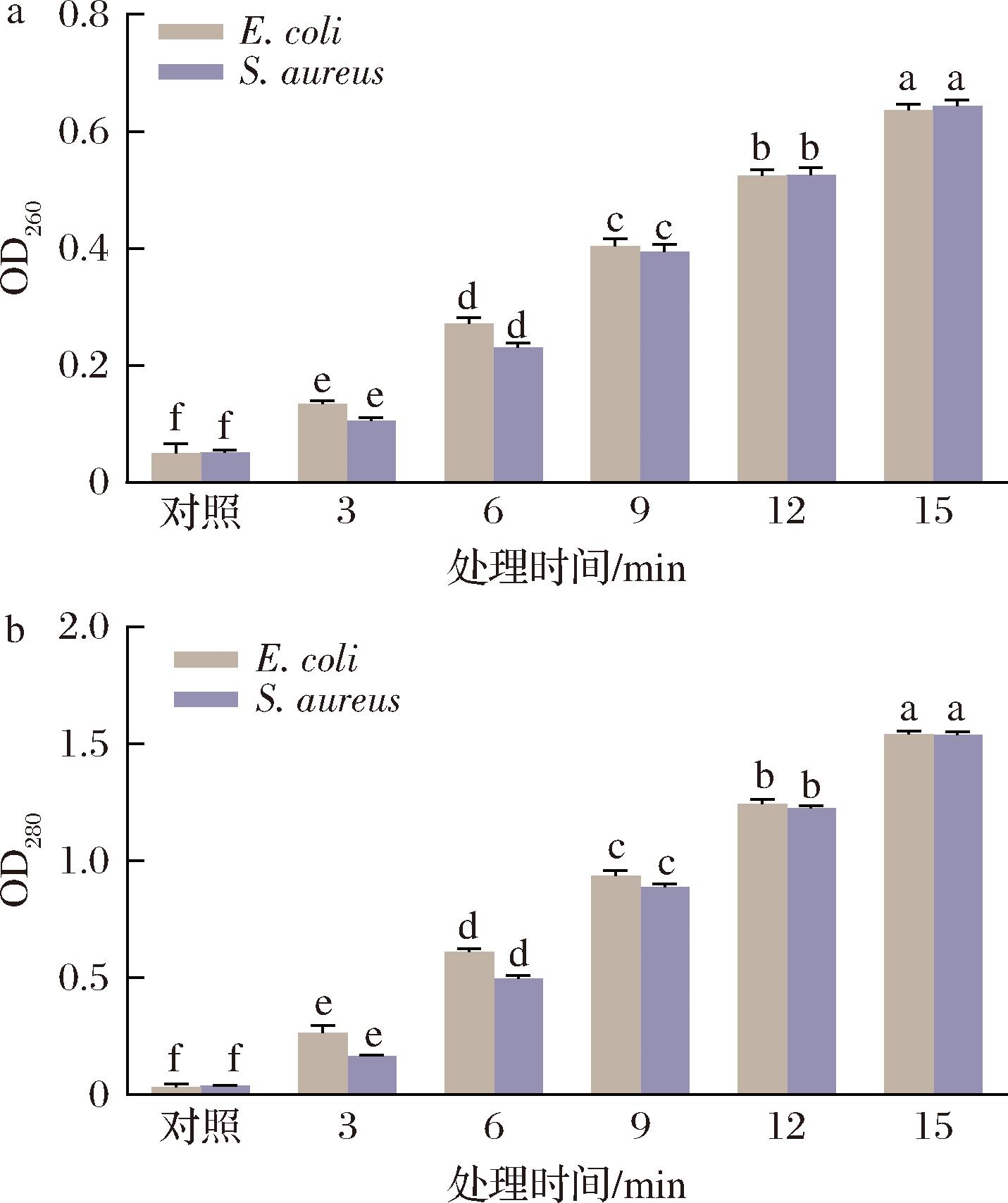 将处理后的菌液在4 ℃、8 000 r/min离心5 min,取上清液。使用紫外分光光度计测定其在260、280 nm波长下吸光度值(OD260和OD280),评估胞内核酸和蛋白的泄漏情况。