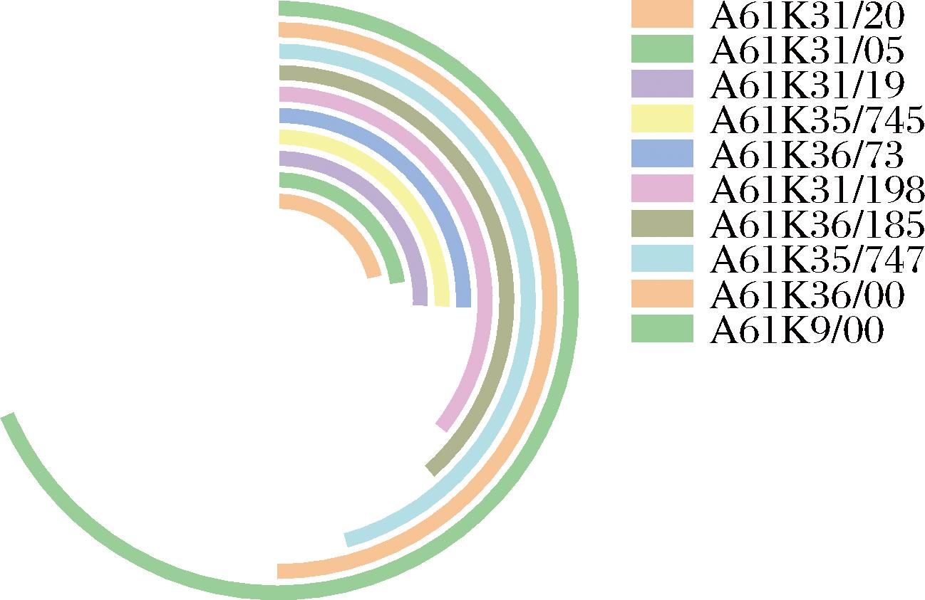 如图11与表5所示,膳食补充剂专利在A61K技术细分类别中的分布情况,A61K技术细分各类别数量相较于A23L较少,其主要集中于天然成分、化学成分与特殊剂型的研发。A61K9/00位居第一,表明膳食补充剂的剂型也是当前的研发热点。A61K36/00、A61K35/747、A61K36/185与A61K36/73反映了天然植物作为膳食补充剂原料的应用,A61K31/198、A61K31/19、A61K31/05与A61K31/20凸显了有机酸等化学物质的重要性,A61K35/745有18件专利代表益生菌也存在较高的技术活跃度。