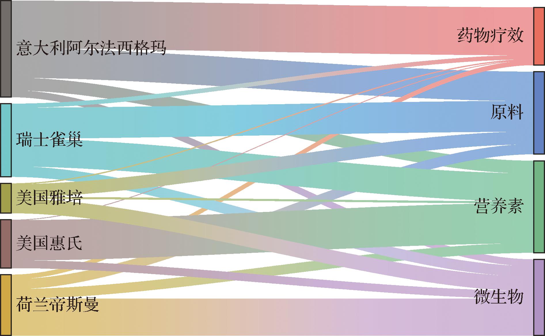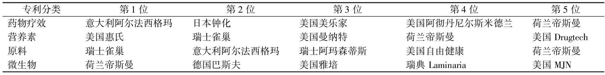 专利分类第1位第2位第3位第4位第5位药物疗效意大利阿尔法西格玛日本钟化美国美乐家美国阿彻丹尼尔斯米德兰荷兰帝斯曼营养素美国惠氏瑞士雀巢美国曼纳特荷兰帝斯曼美国Drugtech原料瑞士雀巢意大利阿尔法西格玛瑞士阿玛森蒂斯美国自由健康荷兰帝斯曼微生物荷兰帝斯曼德国巴斯夫美国雅培瑞典Laminaria美国MJN