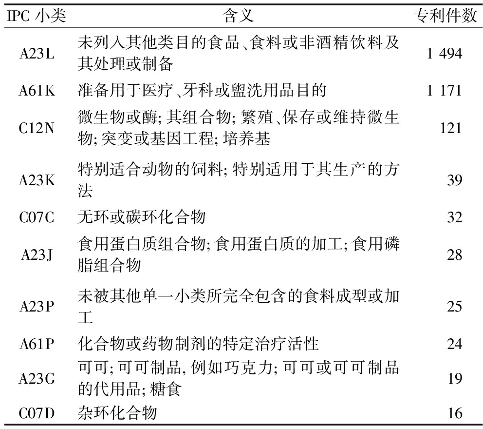 IPC小类含义专利件数A23L未列入其他类目的食品、食料或非酒精饮料及其处理或制备1494A61K准备用于医疗、牙科或盥洗用品目的1171C12N微生物或酶 其组合物 繁殖、保存或维持微生物 突变或基因工程 培养基121A23K特别适合动物的饲料 特别适用于其生产的方法39C07C无环或碳环化合物32A23J食用蛋白质组合物 食用蛋白质的加工 食用磷脂组合物28A23P未被其他单一小类所完全包含的食料成型或加工25A61P化合物或药物制剂的特定治疗活性24A23G可可 可可制品 例如巧克力 可可或可可制品的代用品 糖食19C07D杂环化合物16