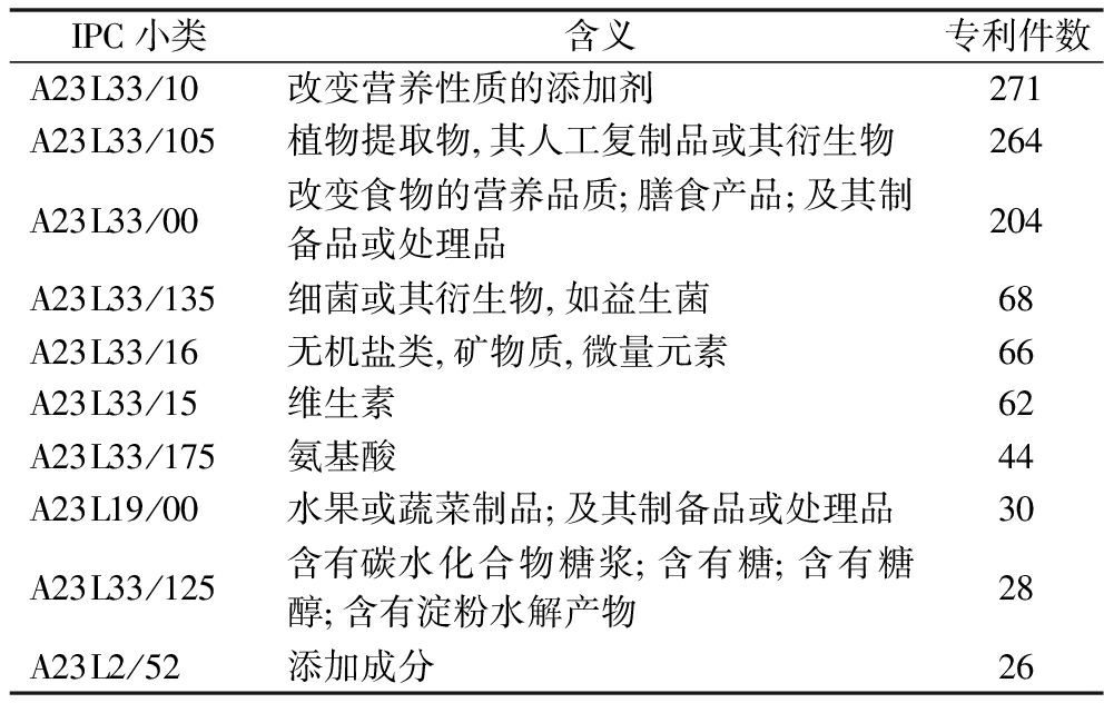 IPC小类含义专利件数A23L33/10改变营养性质的添加剂271A23L33/105植物提取物 其人工复制品或其衍生物264A23L33/00改变食物的营养品质 膳食产品 及其制备品或处理品204A23L33/135细菌或其衍生物 如益生菌68A23L33/16无机盐类 矿物质 微量元素66A23L33/15维生素62A23L33/175氨基酸44A23L19/00水果或蔬菜制品 及其制备品或处理品30A23L33/125含有碳水化合物糖浆 含有糖 含有糖醇 含有淀粉水解产物28A23L2/52添加成分26