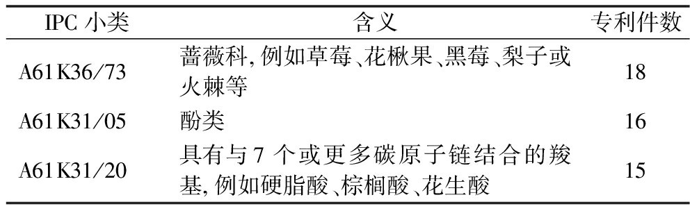 IPC小类含义专利件数A61K36/73蔷薇科 例如草莓、花楸果、黑莓、梨子或火棘等18A61K31/05酚类16A61K31/20具有与7个或更多碳原子链结合的羧基 例如硬脂酸、棕榈酸、花生酸15