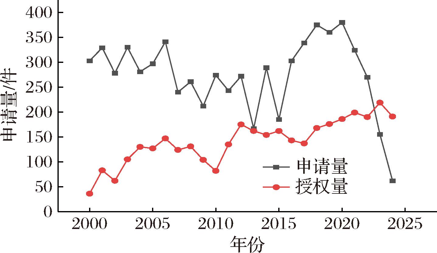 申请与授权趋势图可通过时间序列数据直观展现了行业的技术发展动态,其中专利申请量曲线反映创新活跃度,而授权量曲线则体现技术成果的转化效率。本研究专利申请量主要反映出膳食补充剂行业的创新程度与发展潜力。授权量代表审查通过的授权数量,能够体现出膳食补充剂领域技术创新的水平,高授权量表明良好的创新能力与政策环境,侧面反映出国家或地区的经济发展水平和科研力度。本文对2000年后的膳食补充剂专利申请与授权趋势进行分析,如图8所示。