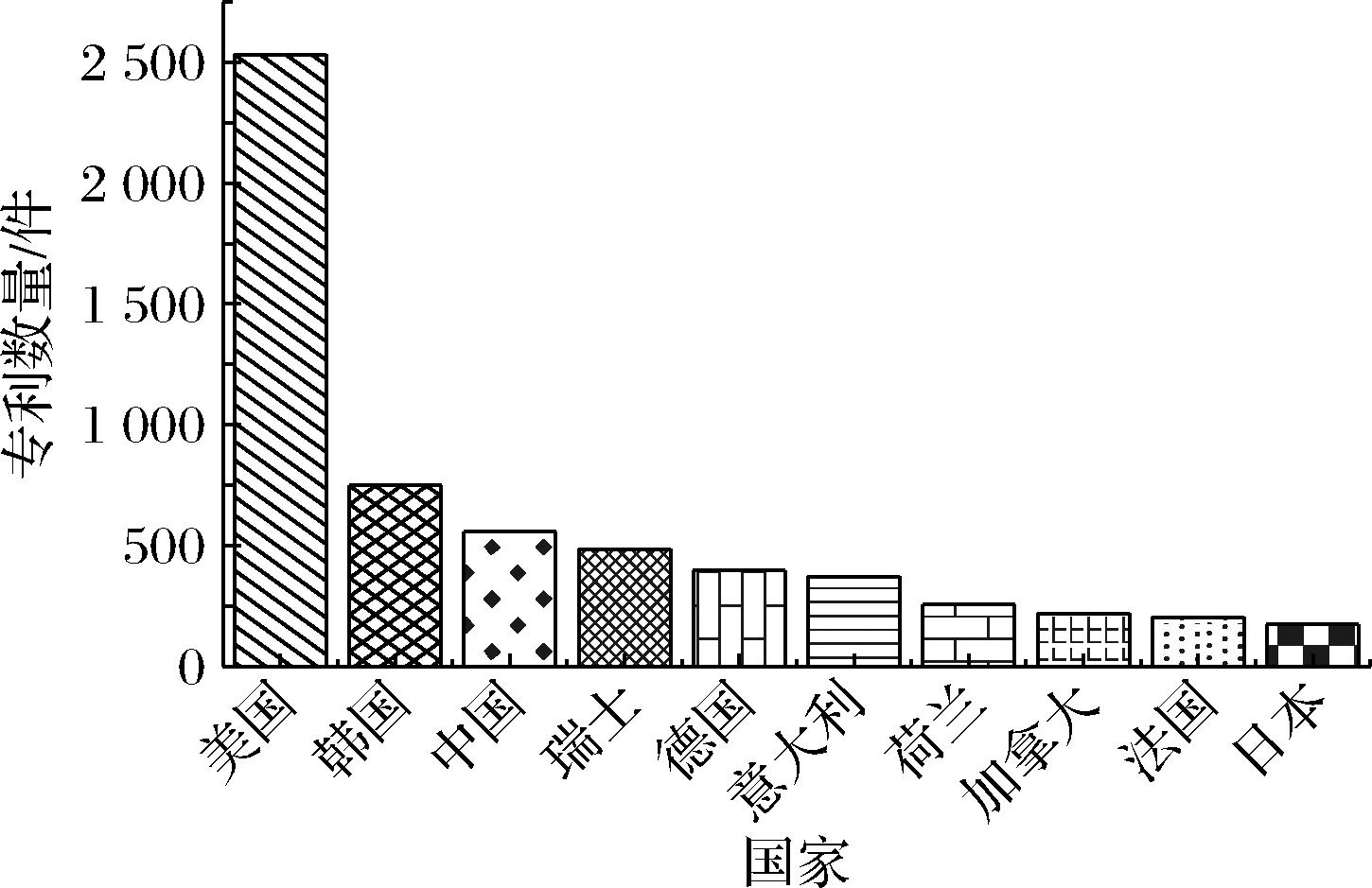 图7为全球膳食补充剂领域专利数量排名前十的国家分布情况,揭示了膳食补充剂技术活跃区域分布,有效辅助了全球膳食补充剂产业布局分析和竞争态势研判。其中美国拥有全球最大的膳食补充剂市场,消费者较为关注营养与健康,膳食补充剂行业是美国经济不可分割的一部分[23]。近年来,韩国消费者购买健康营养品的市场不断扩大,同时技术水平不断提高,例如韩国食品研究院研发出的天然肉类蛋白质“氨基20”生产技术取得成功[24]。中国作为全球第二大经济体,为膳食补充剂专利的研发提供了广阔的发展空间,同时全球跨境电子商务的发展推动着膳食补充剂行业的国际同步和快速发展[25]。瑞士凭借其优渥的自然环境资源与生产的高标准要求,使得瑞士膳食补充剂被视为品质的象征。德国有关膳食补充剂的法规较为严格,规范了膳食补充剂的流通,旨在促进膳食补充剂市场健康发展,保护消费者的健康[26]。意大利、荷兰、加拿大、法国和日本等国家在膳食补充剂某些细分领域仍具有重要地位,例如,加拿大广泛使用天然健康产品,如维生素、矿物质鱼油等补充营养的不足[27]。日本政府高度重视发展健康食品市场,具有药物疗效的食品与草药补充剂等领域研究深厚[28]。