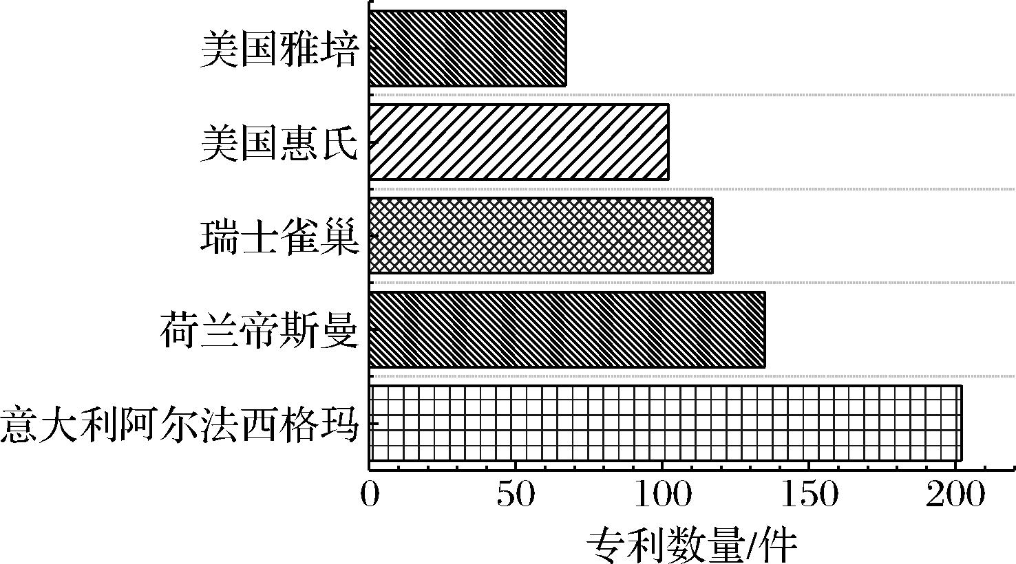 图9提供了全球膳食补充剂领域前五位专利申请人的专利量,呈现了其竞争格局,这种可视化对比能快速识别产业核心竞争者,辅助判断行业技术主导权的分布态势。意大利阿尔法西格玛公司专注于营养产品与膳食补充剂的研发,提供涵盖多种营养物质的膳食补充剂,能够满足不同的健康需求,强调产品的科学性与天然性。荷兰帝斯曼提供各种膳食补充剂原材料,拥有众多的研发中心,旨在满足消费者健康需求。瑞士雀巢在膳食补充剂领域成立核心部门“雀巢健康科学”,为特定的健康需求提供科学的解决方案,推动着膳食补充剂领域的创新。美国惠氏排名第4,主要提供以含维生素与矿物质为主的膳食补充剂。美国雅培在婴儿营养、成人营养和特殊用途食品领域都存在较强的创新能力和市场影响力。