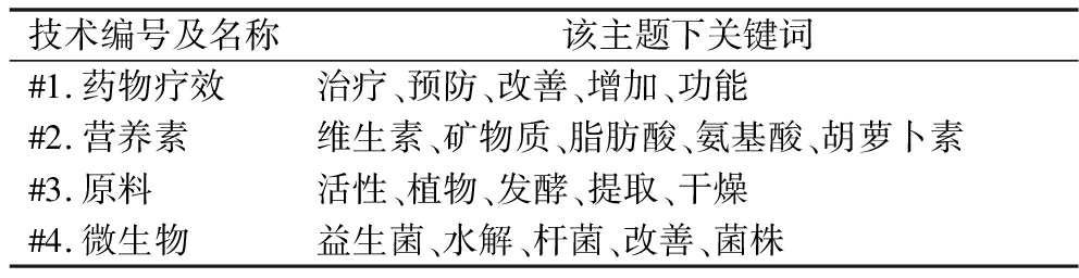 上述4个主题的分析得出膳食补充剂专利所涉及的四大领域,分别是“药物疗效”“营养素”“原料”与“微生物”,如表1所示。