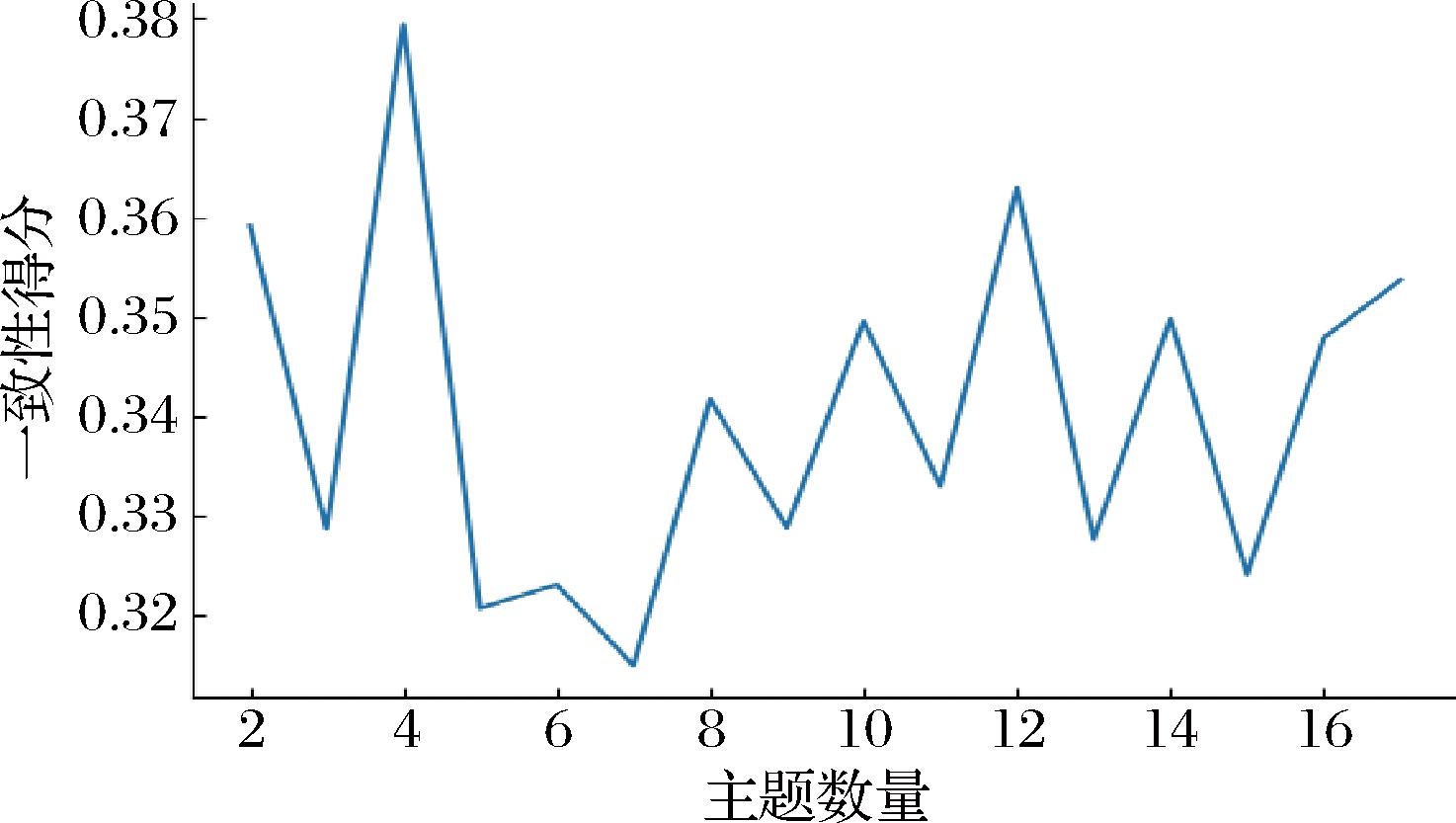如图4一致性得分曲线所示,主题数为4时得分达到峰值,明显高于其他主题数量下的得分值,这一结果表明4个主题的划分能够最好地保持主题内部的词语高度相关,同时确保不同主题之间具有足够的区分度,能够最好地反映文本数据的主题结构。综合困惑度与一致性得分结果,本文选择最优主题数为4。