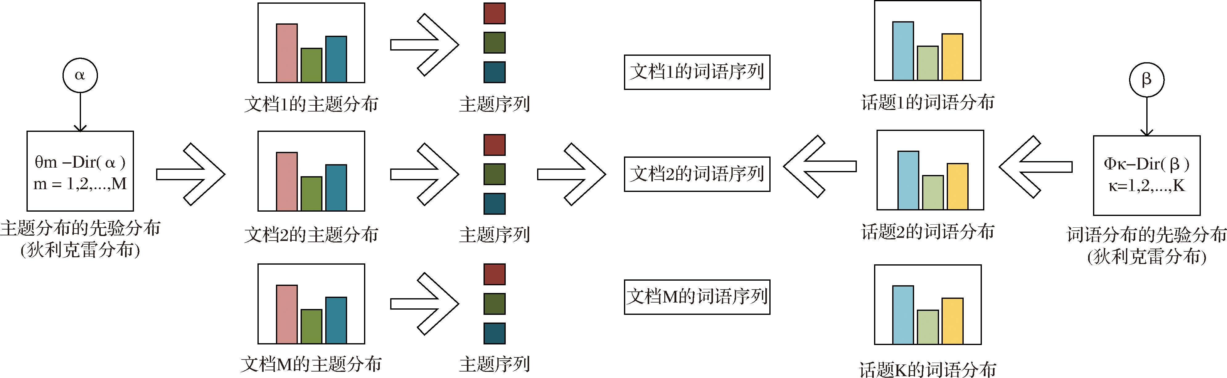 LDA主题模型是一种无监督的机器学习方法,其通过构建模型来识别文档中的主题信息,挖掘出隐藏的主题信息,利用词语、主题、文本之间的关系解决文本聚类中语义挖掘的问题[10],是由BLEI等[11]在2003年首次提出的一种主题建模的贝叶斯概率方法,主要通过概率分布来表示每个文档中包含的主题以及每个主题中词语的分布情况。图2展示了LDA的文本生成过程,首先,LDA模型从先验分布(狄利克雷分布)Dirt(β)中随机生成K个主题的关键词分布Φκ,然后从另一个先验分布(狄利克雷分布)Dirt(α)中随机生成M篇文档的文档-主题分布θm,从而确定每篇文档的主题序列。最后,基于文档中的词数Nm(通常假设服从泊松分布)和关键词分布Φκ,生成每篇文档的具体词汇序列[12]。